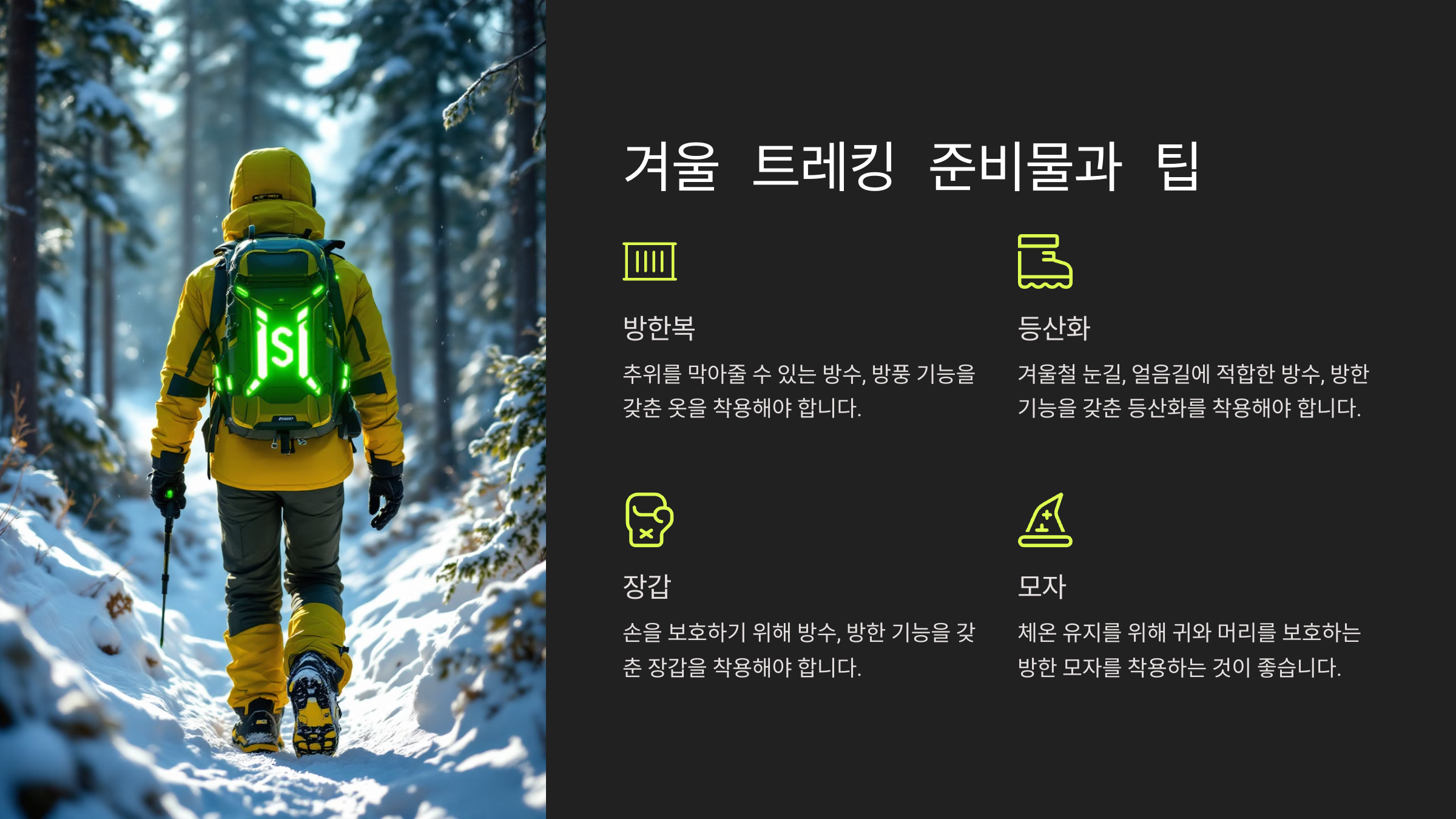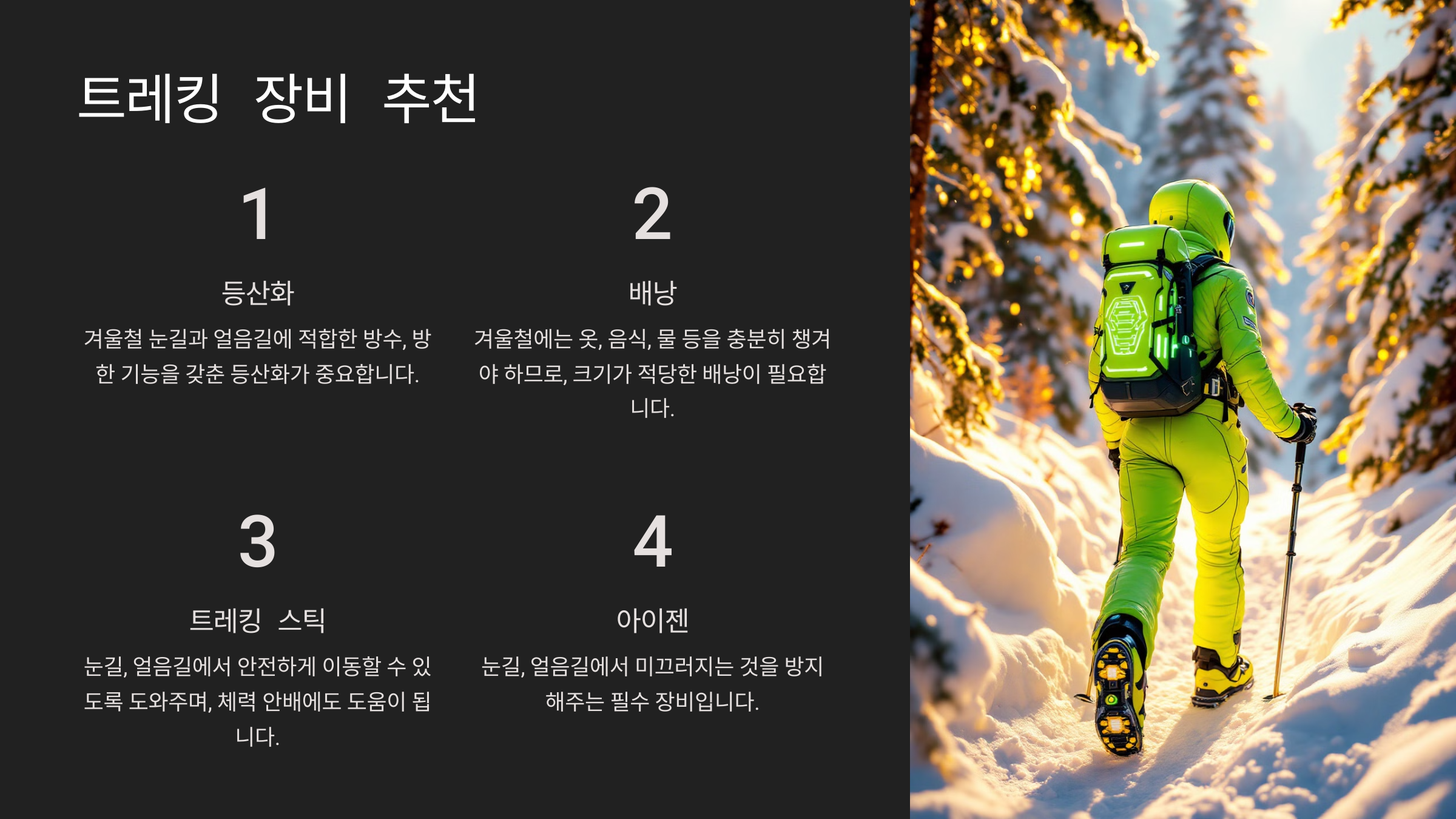 다만 겨울철에는 낮은 기온과 예상치 못한 날씨 변화 때문에 철저한 준비가 필요해요. 적절한 의복, 장비, 그리고 안전 수칙을 숙지하면 보다 즐겁고 안전한 겨울 트레킹을 즐길 수 있답니다. 지금부터 국내외 인기 코스와 꿀팁을 소개할게요!