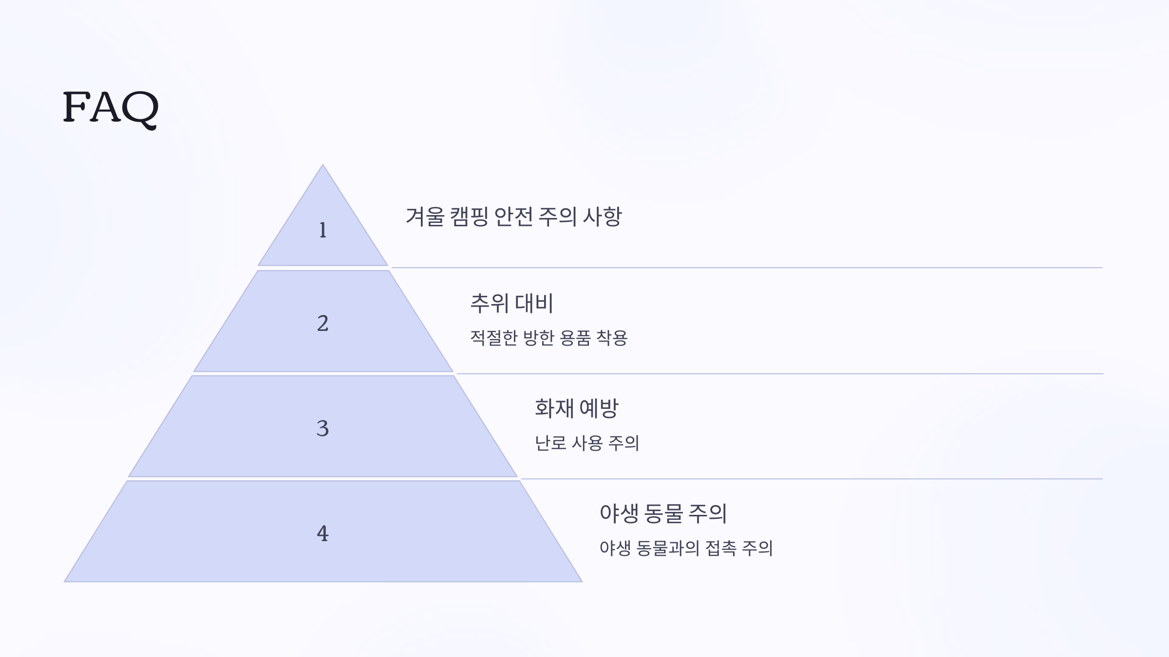 A1. 방한 장비와 보온 장치를 철저히 준비하는 것이 가장 중요해요. 난방 기구 사용 시 환기를 필수적으로 해야 하며, 캠핑장 선택 시 눈이나 빙판길을 고려하세요.
