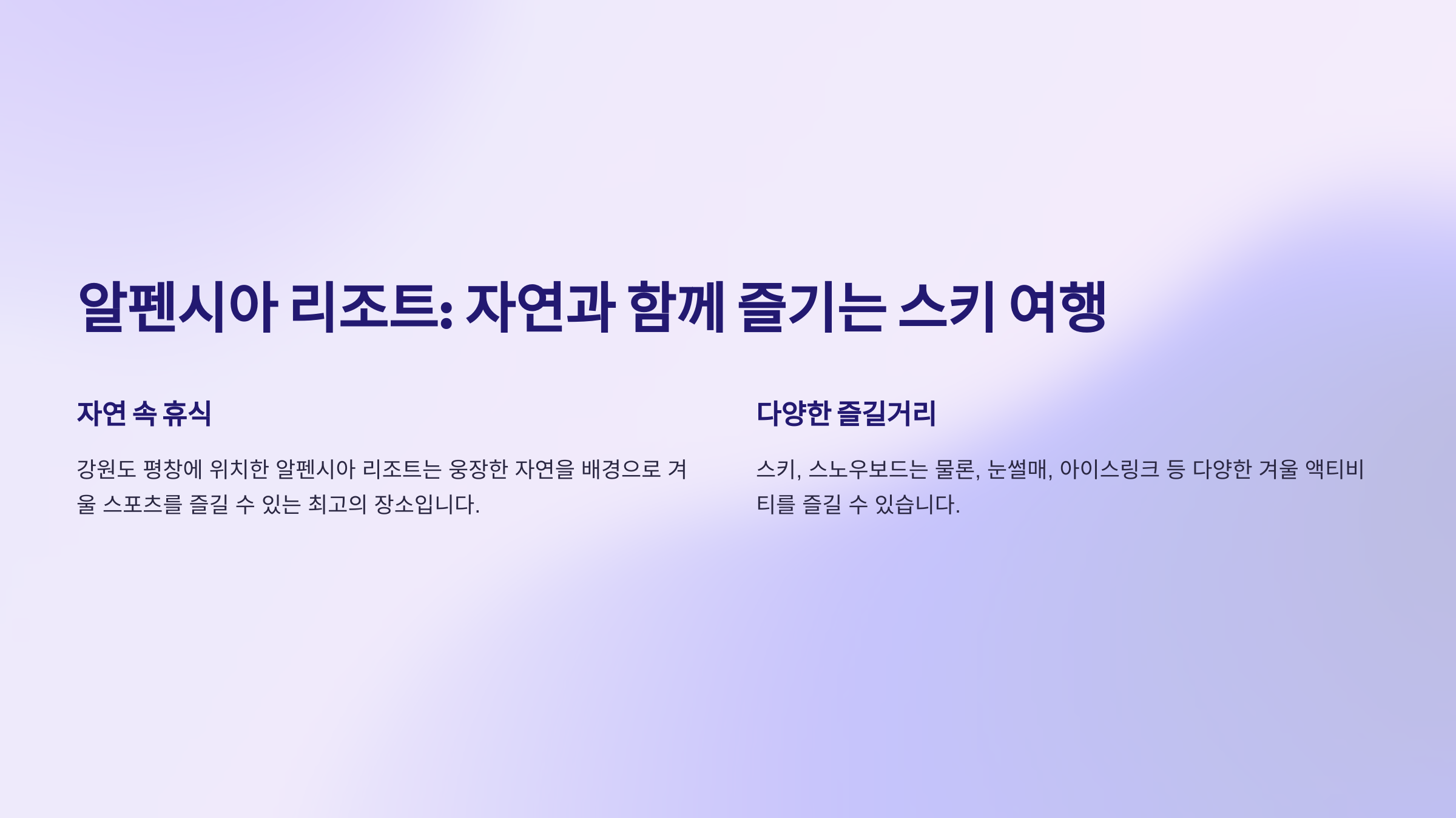 강원도 평창에 위치한 알펜시아 리조트는 국제적인 명성을 가진 스키장이에요. 2018 평창 동계올림픽의 주요 경기장이기도 했던 이곳은 다양한 슬로프와 최상의 설질로 스키 애호가들에게 사랑받고 있어요.