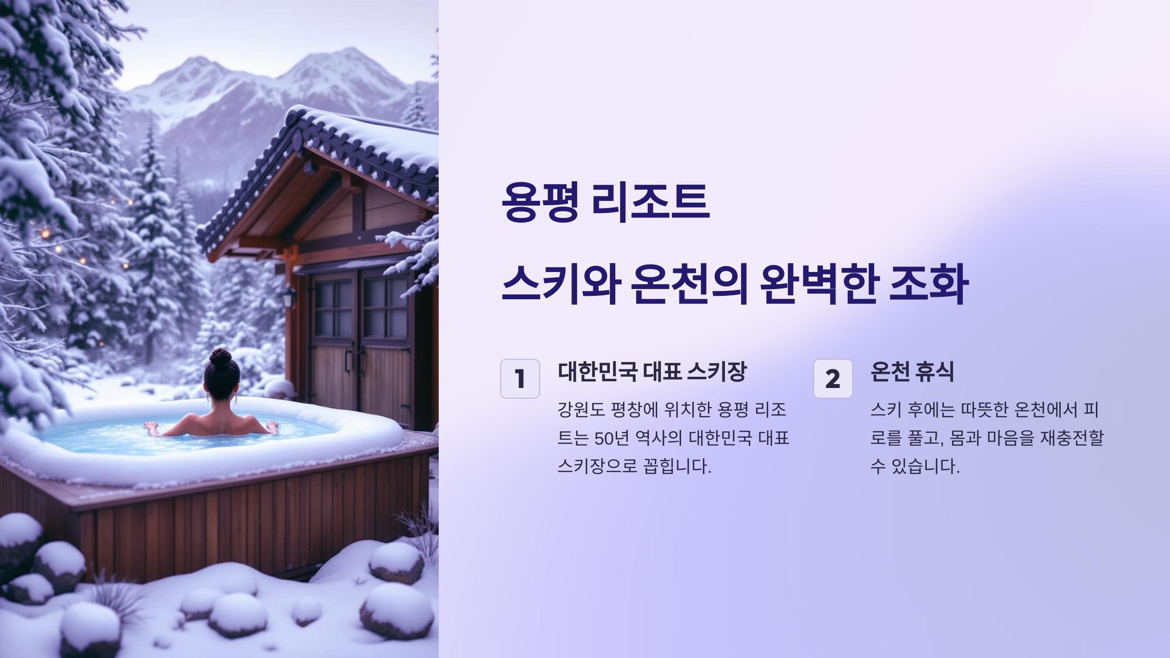 용평 리조트는 겨울 스포츠 외에도 다양한 즐길 거리를 제공해요. 리조트 내 워터파크와 스파 시설을 이용하며 따뜻한 휴식을 취할 수 있어요. 가족, 연인, 친구 누구와 함께 가도 만족스러운 시간을 보낼 수 있는 곳이에요.
