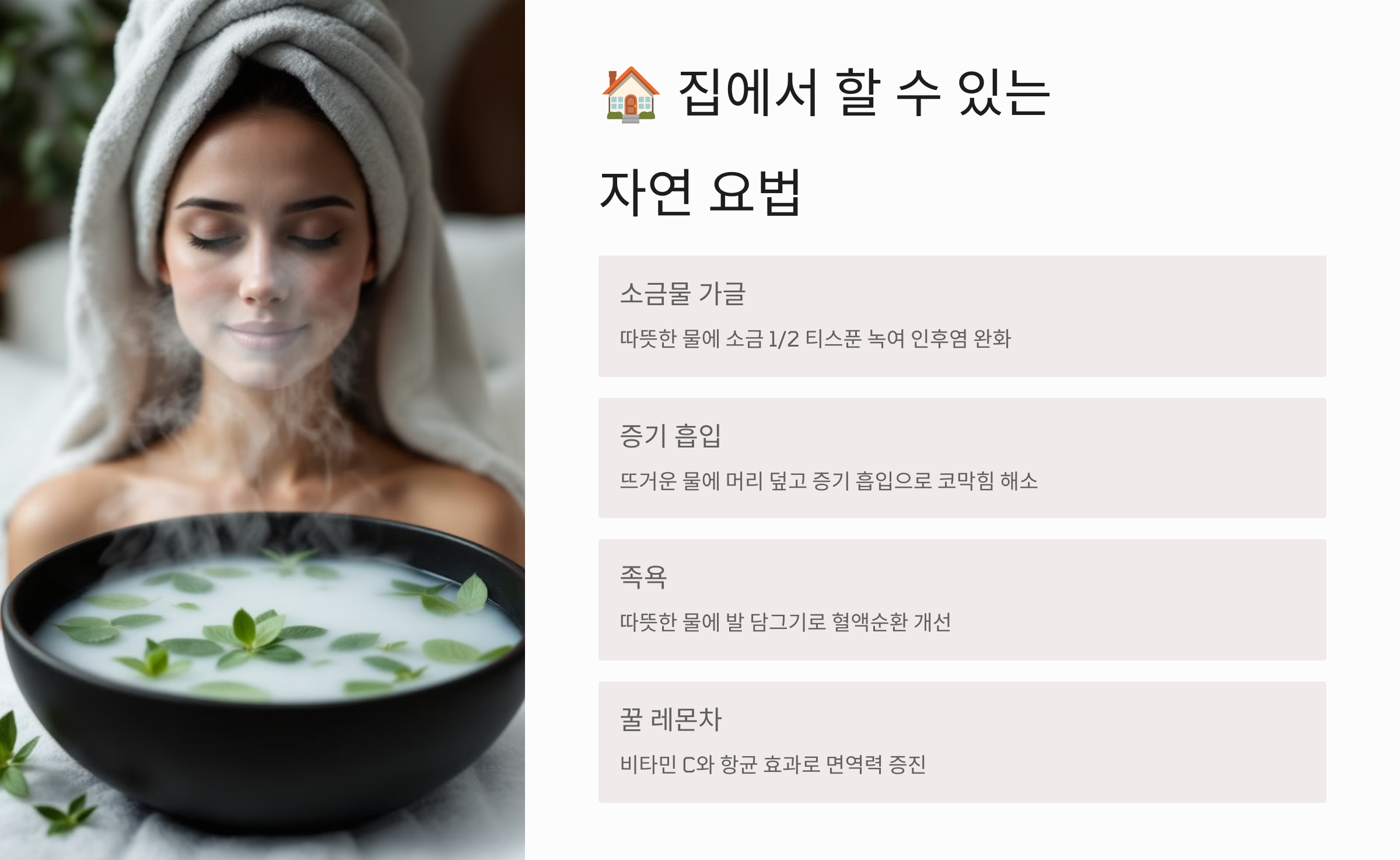그럼 다음은 🏠 집에서 할 수 있는 자연 요법 병원 가지 않아도 실천 가능한 자연 치유법 알려드릴게요 😊
