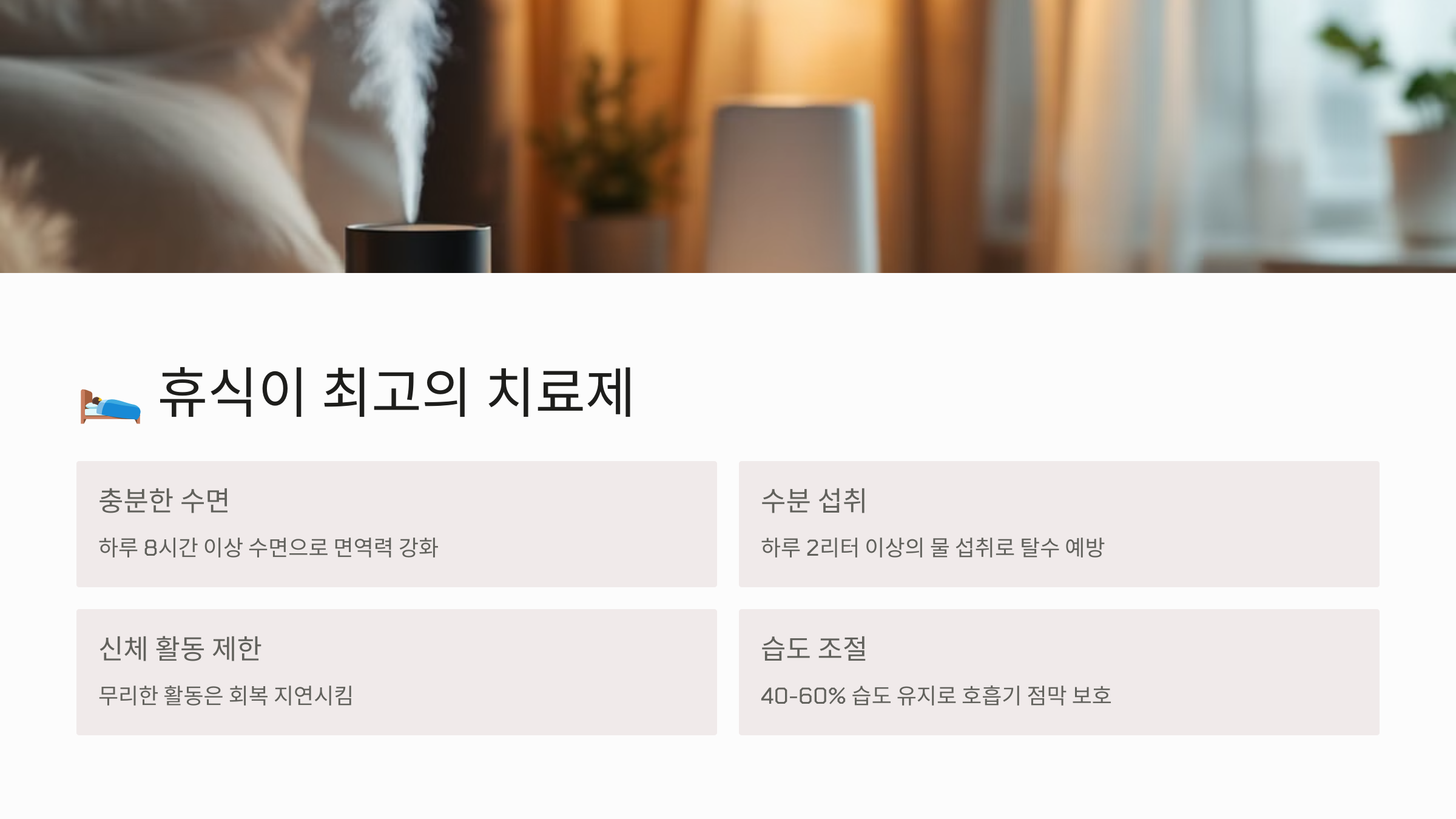 ✅ 5. 가습기 or 젖은 수건 건조한 공기는 감기몸살을 더 악화시켜요. 습도 40~60%를 유지해야 코 점막이 보호돼요. 가습기가 없으면 젖은 수건을 걸어두는 것만으로도 충분히 효과 있답니다.