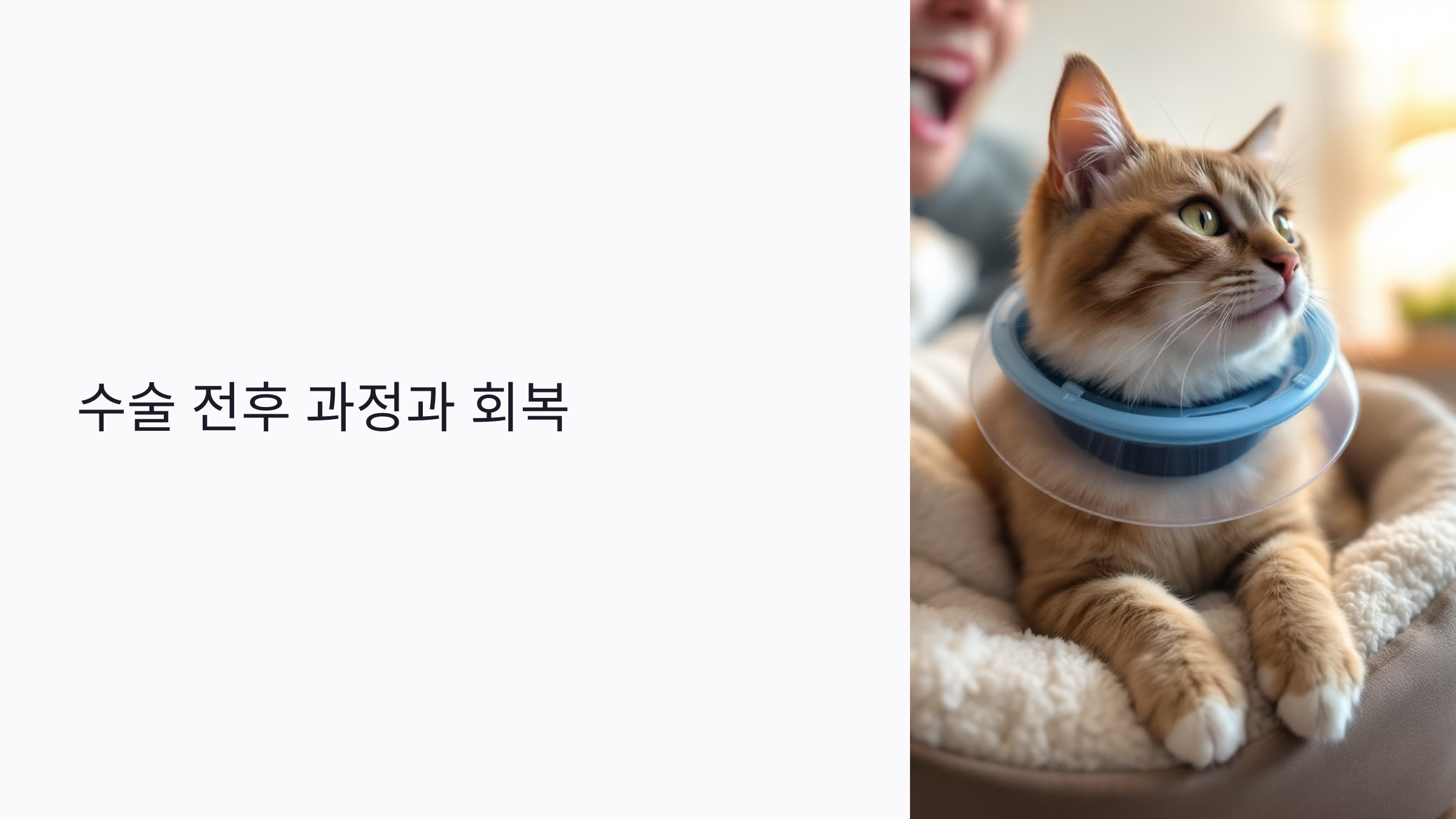 수술 후 4~6시간 후엔 식사 가능하지만, 소량만 주는 것이 좋아요. 갑자기 많은 양을 먹이면 구토나 설사를 유발할 수 있어요. 물도 소량씩 자주 주되, 억지로 먹이려고 하지 말고 자연스럽게 두는 게 포인트예요.