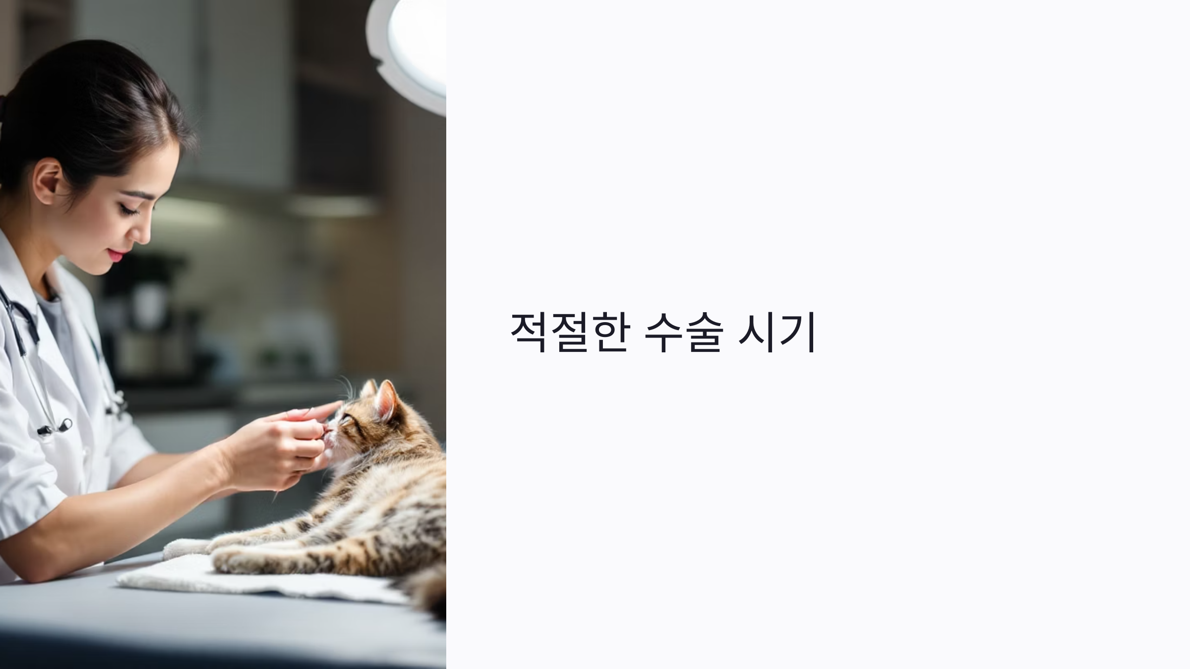 | 암컷 고양이 | 생후 4~5개월 | 첫 발정 전 수술 시 유선암 예방 효과 큼 |