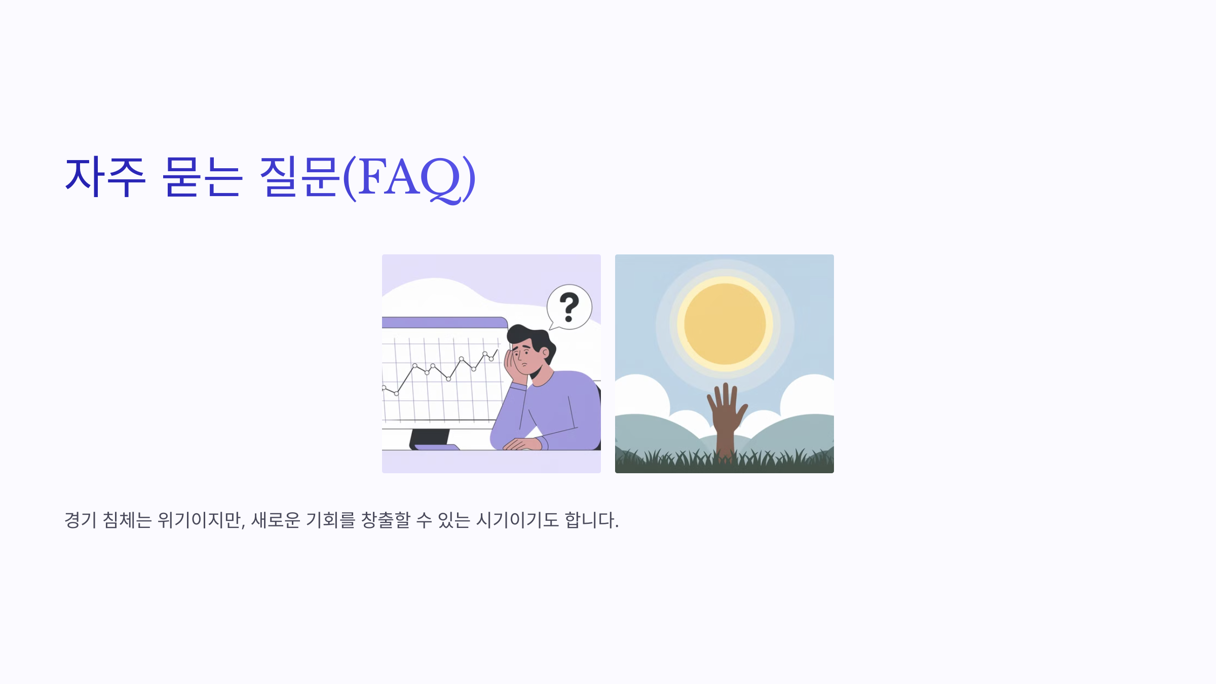 A8. 저평가된 우량 자산(주식, 부동산)을 장기적으로 투자하거나, 경기 침체에도 꾸준히 성장하는 산업(헬스케어, IT, 필수 소비재)에 관심을 가지는 것이 좋은 전략이에요.