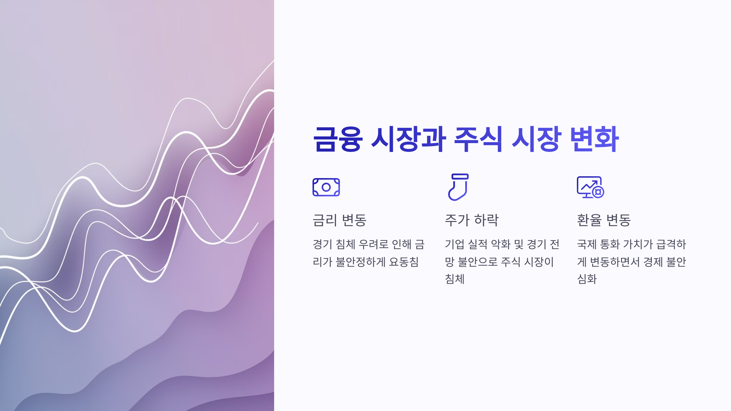 글로벌 경기 침체가 심화되면 소비, 투자, 고용 시장이 모두 위축될 가능성이 커요. 이제 금융 시장과 주식 시장의 변화에 대해 자세히 알아볼게요. 📉