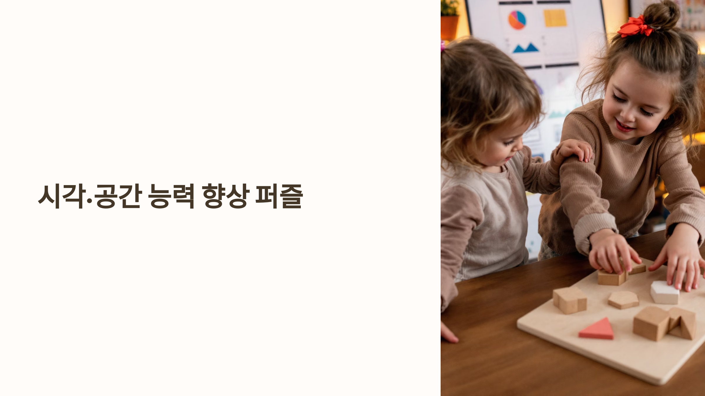 시각·공간 퍼즐은 좌뇌보다 우뇌를 활발히 사용하는 활동이에요. 그림을 해석하거나 블록을 조합하면서 아이의 ‘공간 사고력’이 강화돼요. 수학이나 과학을 좋아하게 되는 기초 능력으로 연결되죠. 🔍