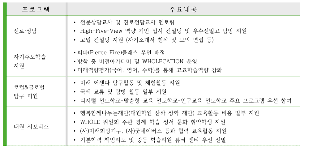 - 전문 진로 상담 프로그램을 통해 학생 개개인의 적성과 목표를 파악하고 이를 바탕으로 학습 방향을 제시합니다.