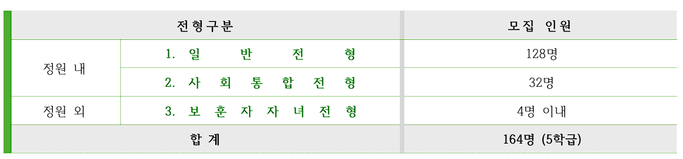- 일반전형 128명, 사회통합전형 32명, 보훈자자녀전형 4명 이내로 모집