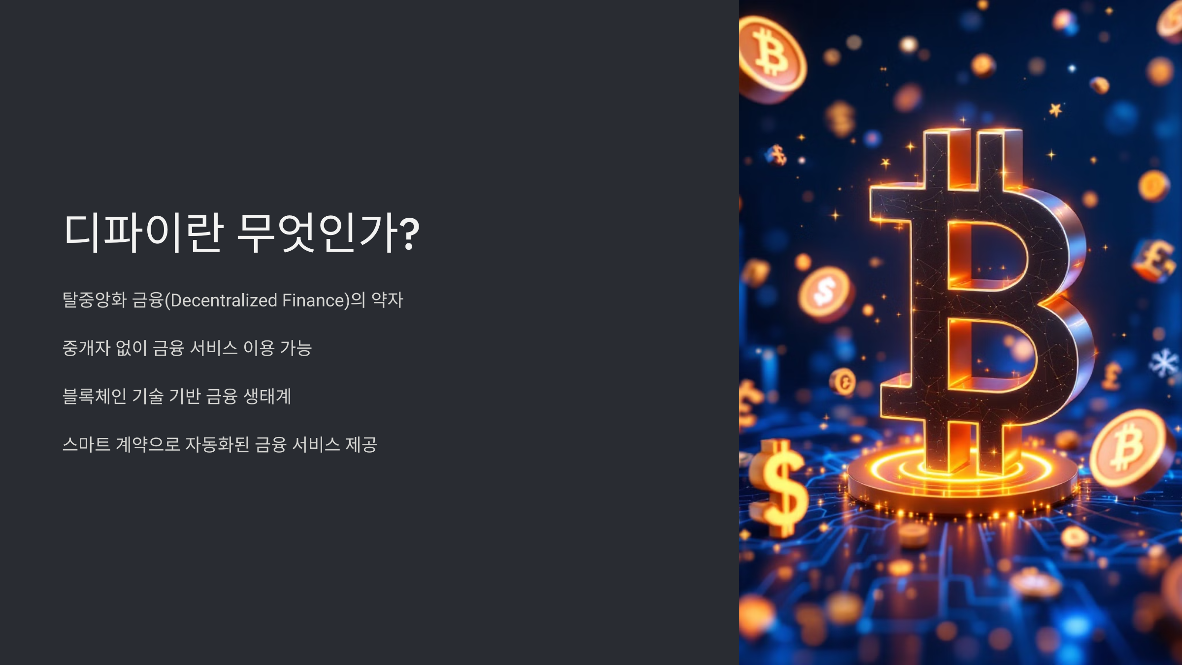디파이(DeFi)는 ‘탈중앙화 금융(Decentralized Finance)’의 약자로, 중앙기관 없이 블록체인 기술을 활용해 금융서비스를 제공하는 생태계를 말해요. 쉽게 말해 은행, 증권사, 보험사 같은 중개기관 없이 금융 거래가 이루어지는 시스템이에요.