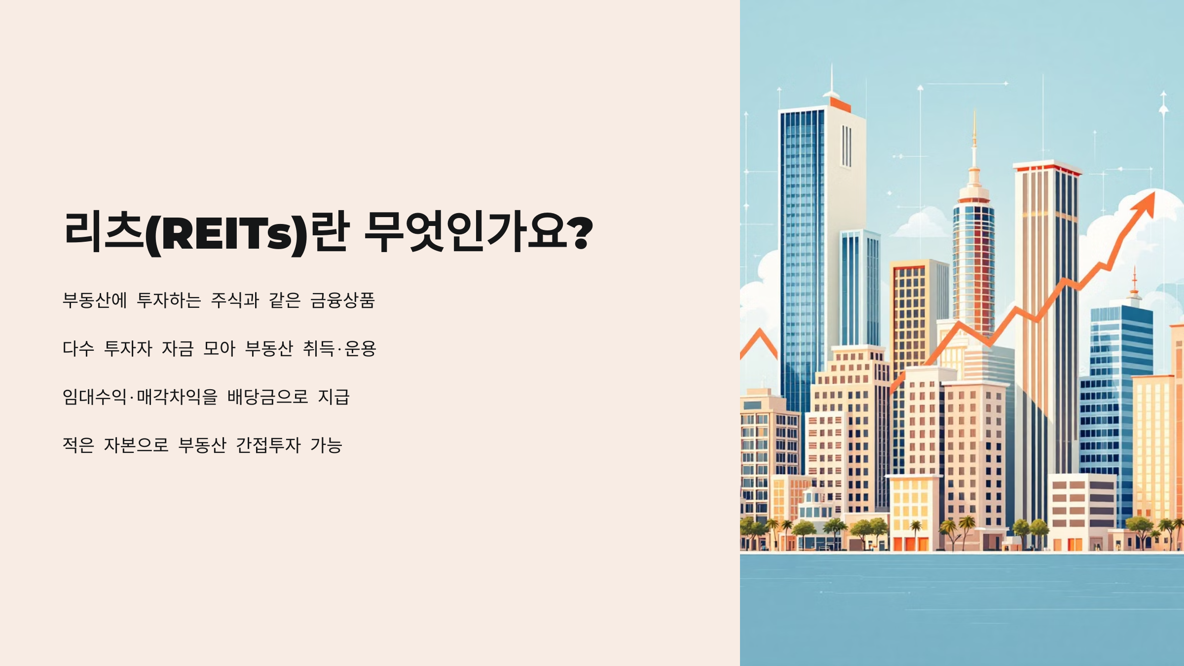 요즘 투자 시장에서 꾸준히 관심을 받고 있는 ‘리츠(REITs)’. 부동산 직접투자보다 부담이 적으면서도 월세 수익처럼 배당을 받을 수 있어 인기가 많아요. 특히 2025년 들어 안정성과 수익성을 모두 갖춘 투자처로 주목받고 있어요.