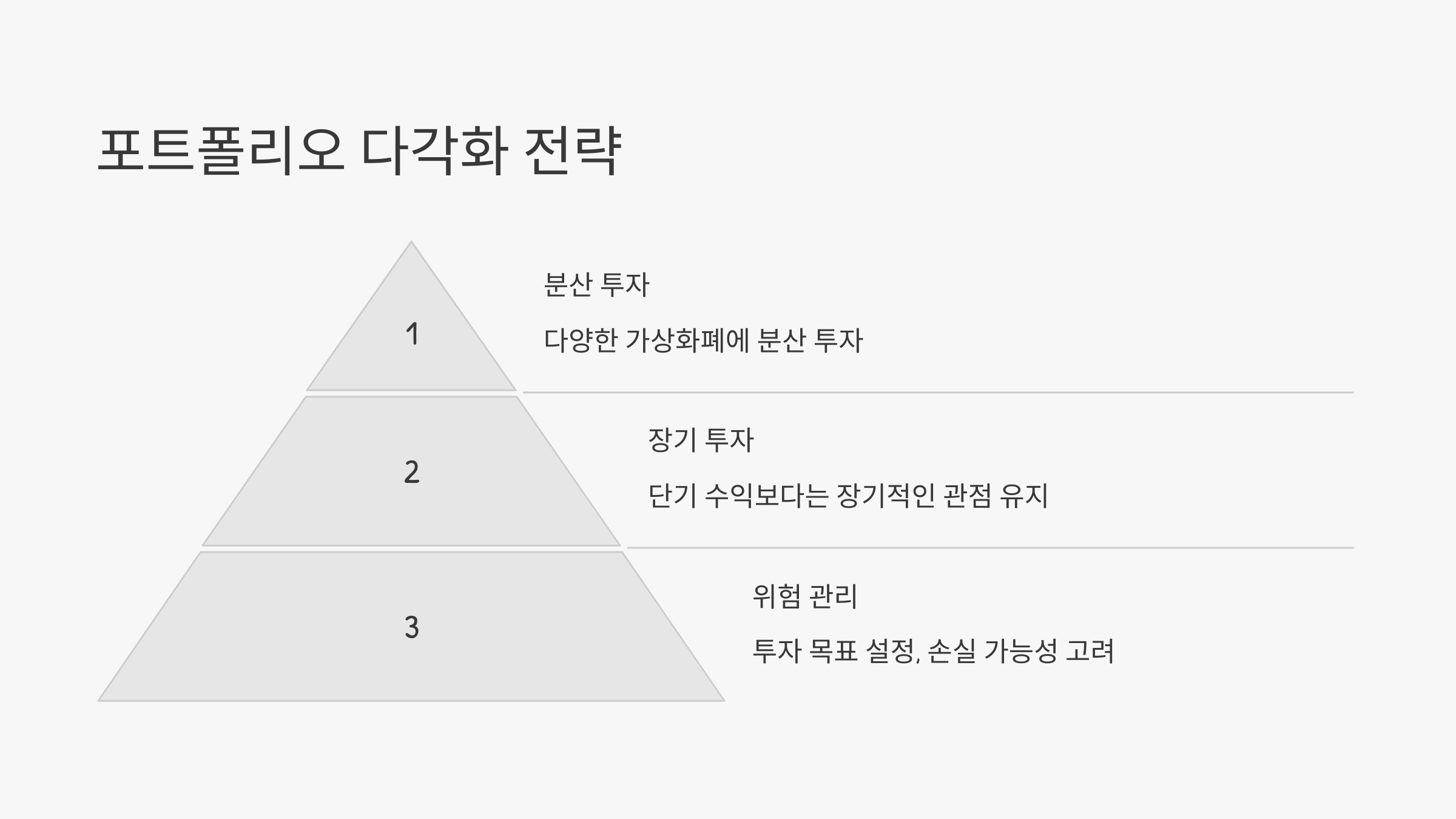 단일 가상화폐에 모든 자산을 투자하는 것은 리스크가 커요. 비트코인(BTC)과 같은 주요 가상화폐는 안정성이 상대적으로 높은 반면, 알트코인(예: 이더리움, 솔라나, 폴카닷 등)은 높은 성장 잠재력을 가지고 있어요. 하지만 그만큼 위험도 크기 때문에 비트코인과 알트코인을 적절히 섞어 투자 포트폴리오를 구성하는 것이 좋아요.