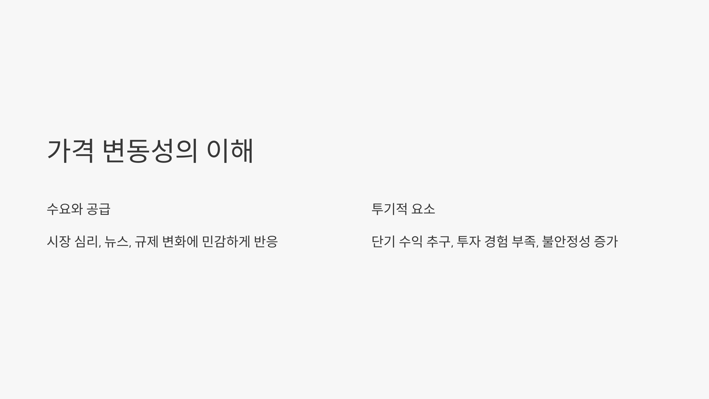 가상화폐는 하루에도 수십 퍼센트씩 가격이 오르내리는 극심한 변동성을 보여요. 이는 가상화폐 시장이 아직 성숙하지 않았고, 소수의 대형 투자자가 시장을 움직일 수 있기 때문이에요. 예를 들어, 비트코인은 2021년 한 해 동안 $30,000에서 $69,000까지 급등한 후 다시 급락했어요. 이러한 변동성은 큰 수익을 낼 가능성을 제공하지만, 큰 손실로 이어질 수도 있어요.