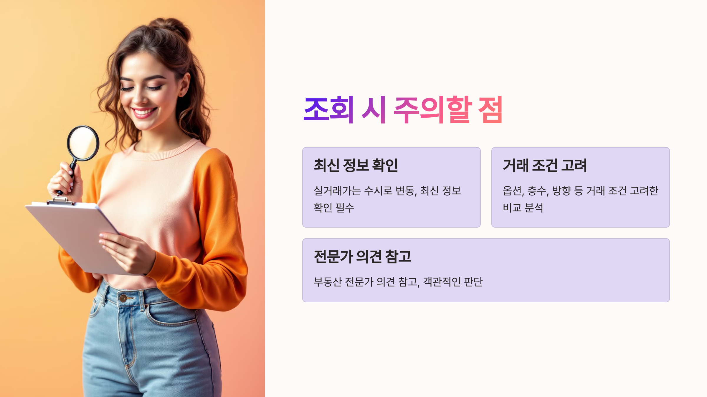 실거래가 조회 시에는 몇 가지 주의할 점이 있어요. 첫째, 시간 차이를 고려해야 해요. 실거래가는 신고 후 일정 기간이 지나야 공개되기 때문에, 최신 거래 정보는 반영되지 않을 수 있답니다. 따라서 가장 최근 데이터는 부동산 중개인을 통해 확인하는 것도 좋아요.