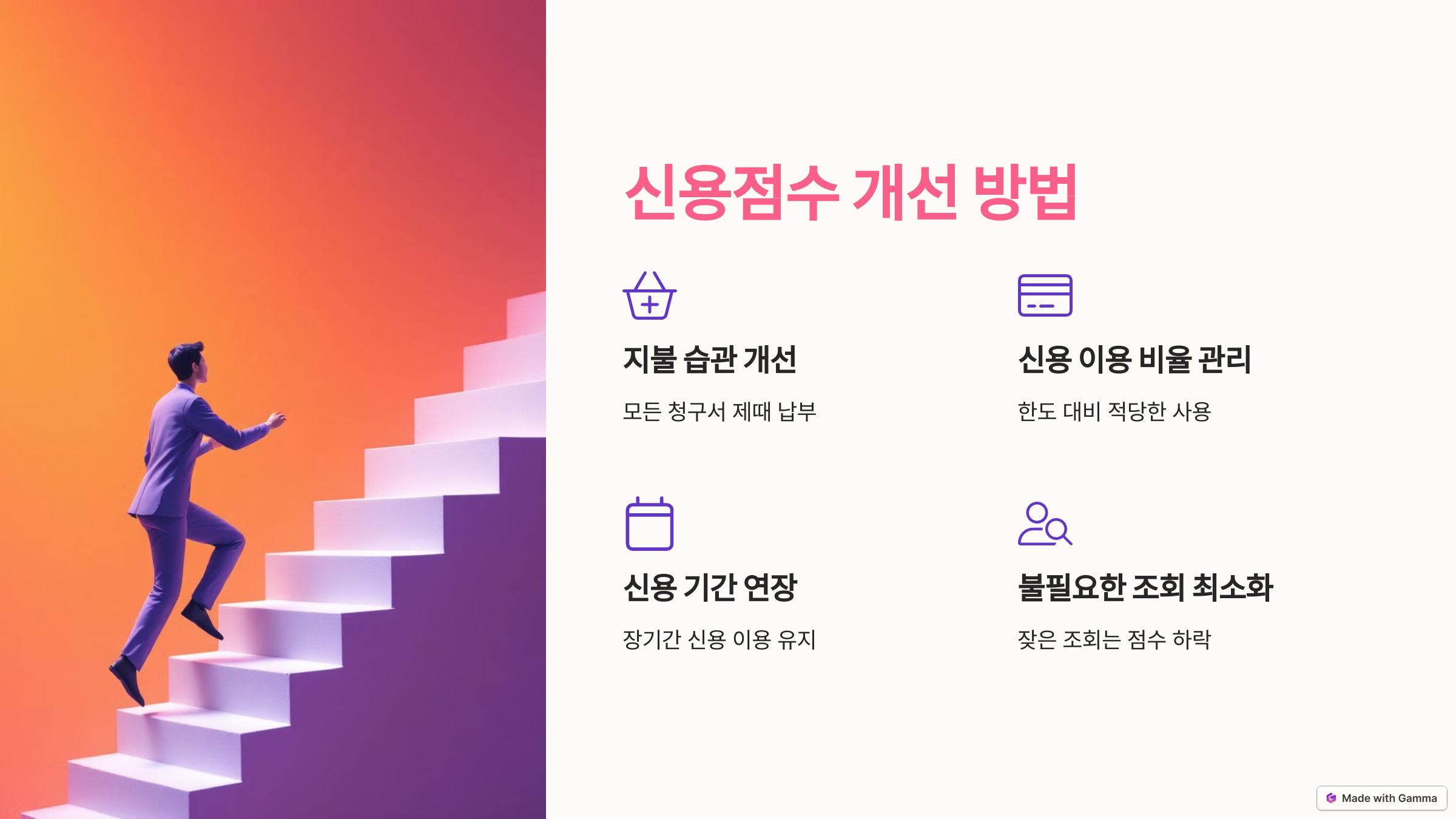 신용점수를 개선하는 가장 기본적인 방법은 제때 결제를 유지하는 것이에요. 모든 대출 상환과 신용카드 결제는 마감일까지 완료해야 점수에 긍정적인 영향을 줘요. 연체는 신용점수에 가장 큰 손실을 주기 때문에, 자동 이체 설정이나 결제 알림을 활용하면 좋아요.