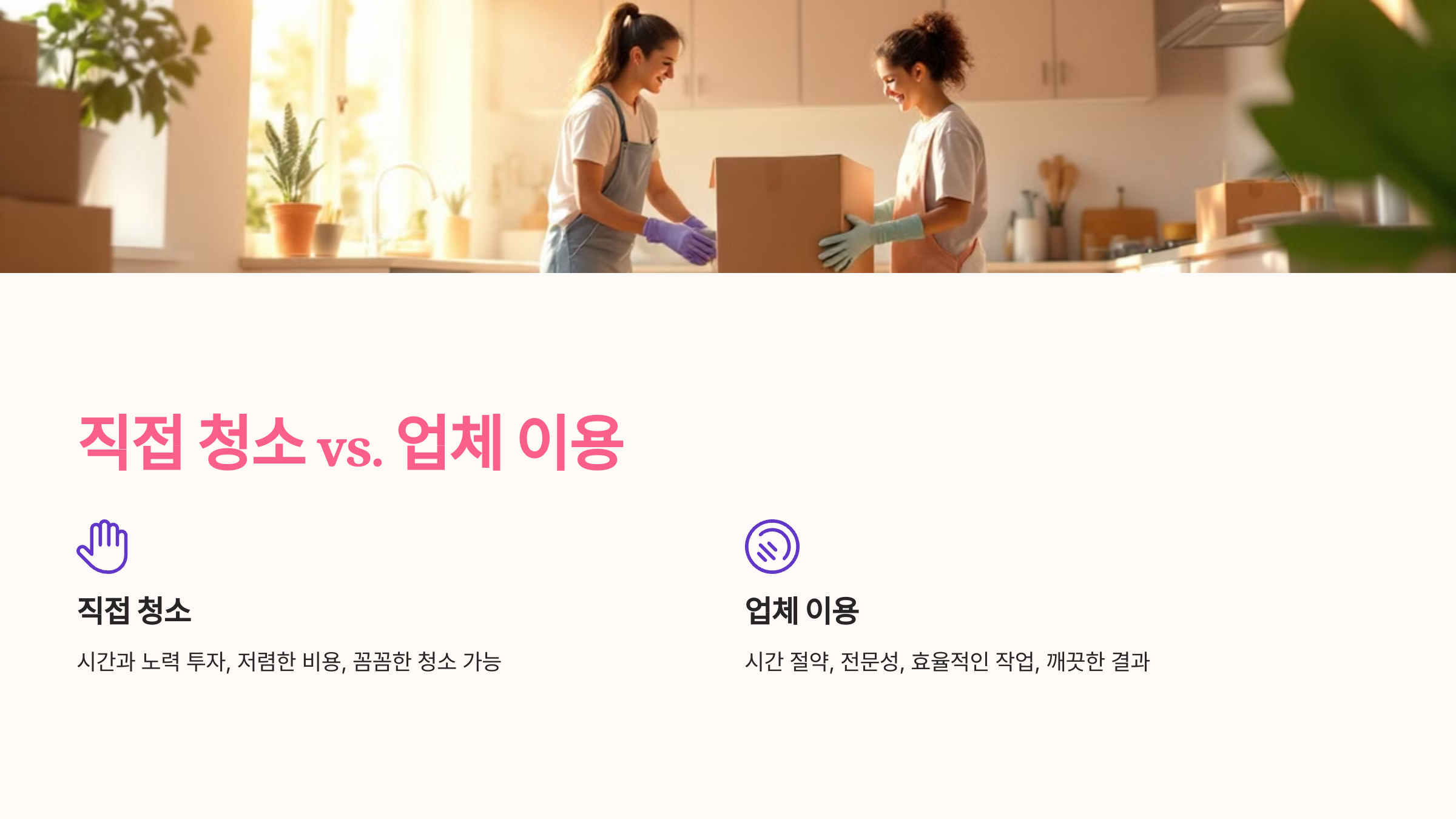 반면, 청소 업체를 이용하면 시간과 노동력을 아낄 수 있어요. 특히 큰 집이나 상태가 나쁜 공간의 경우 전문가의 도움을 받는 것이 효율적이에요. 전문가들은 고급 장비와 노하우로 직접 청소보다 더 깊은 청결을 보장할 수 있답니다.
