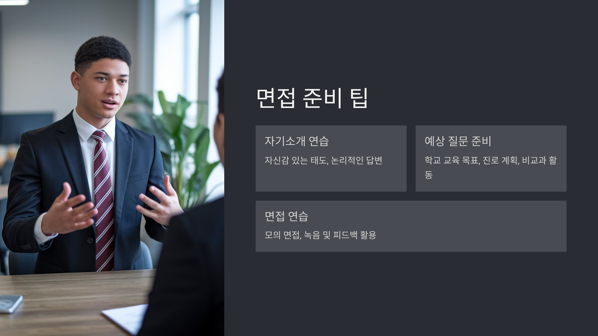 자사고 입시에서 면접은 학생의 태도와 열정을 보여줄 수 있는 중요한 단계예요. 아래 팁을 참고해 면접을 준비해 보세요.