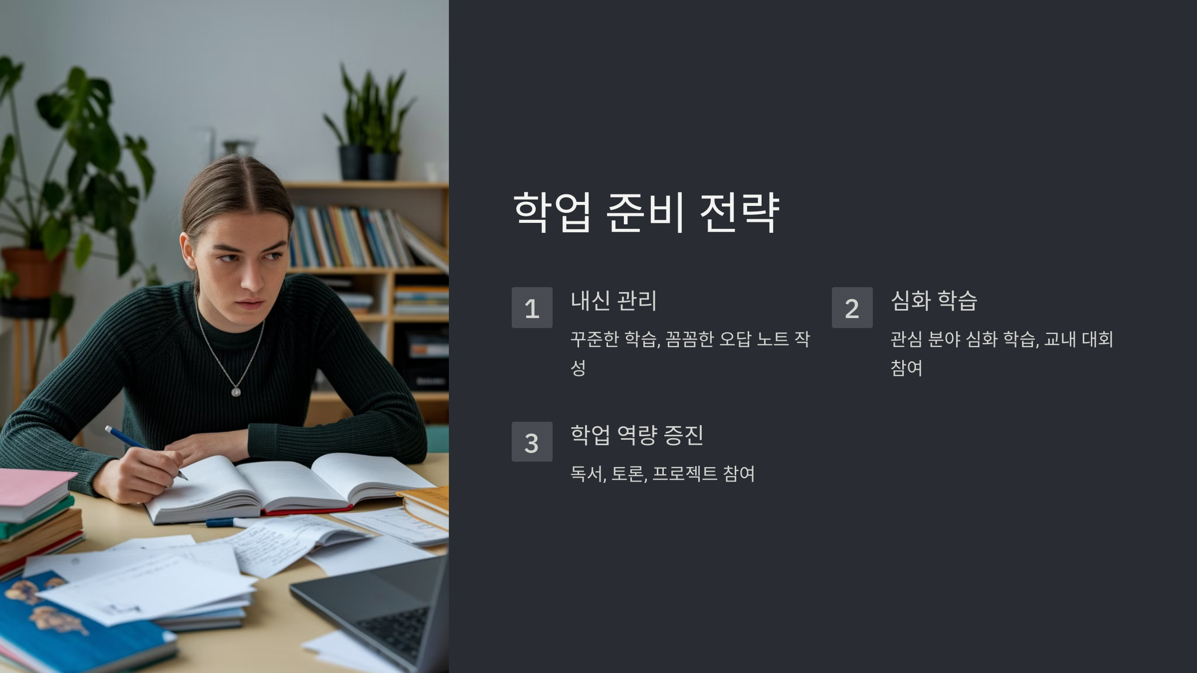 자사고 입시는 학업 역량을 평가하는 데 중점을 두기 때문에 철저한 학업 준비가 필요해요. 아래의 전략을 참고해 보세요: