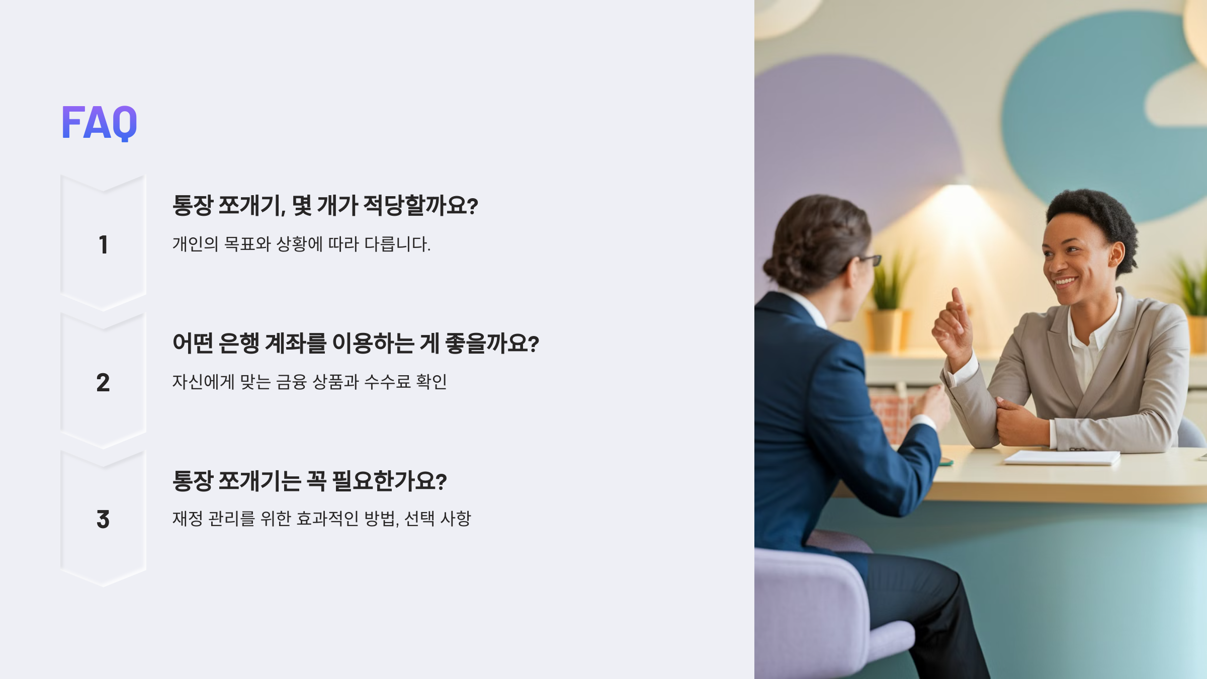 A7. 통장 쪼개기는 돈 관리의 첫걸음이에요. 이후 투자와 저축 계획을 더해 재테크를 체계적으로 발전시켜야 해요.