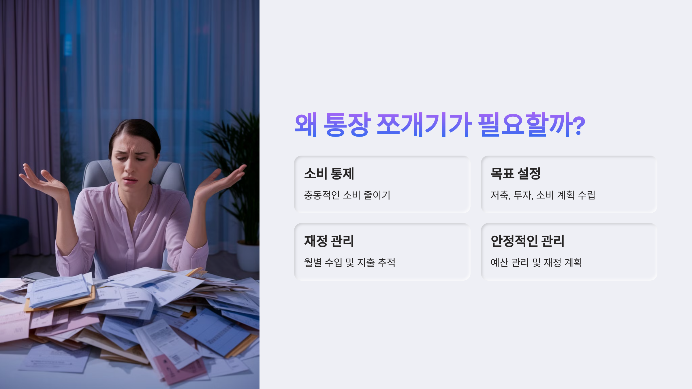 통장 쪼개기가 필요한 이유는 무엇보다도 효율적인 돈 관리를 돕기 때문이에요. 하나의 통장에서 모든 지출과 저축을 관리하면, 돈이 어디에 쓰였는지 파악하기 어렵고 예산을 초과해 지출할 가능성도 높아져요. 반면, 목적별로 나뉜 통장은 돈의 흐름을 더 명확하게 보여주고 관리하기 쉽게 만들어줘요.