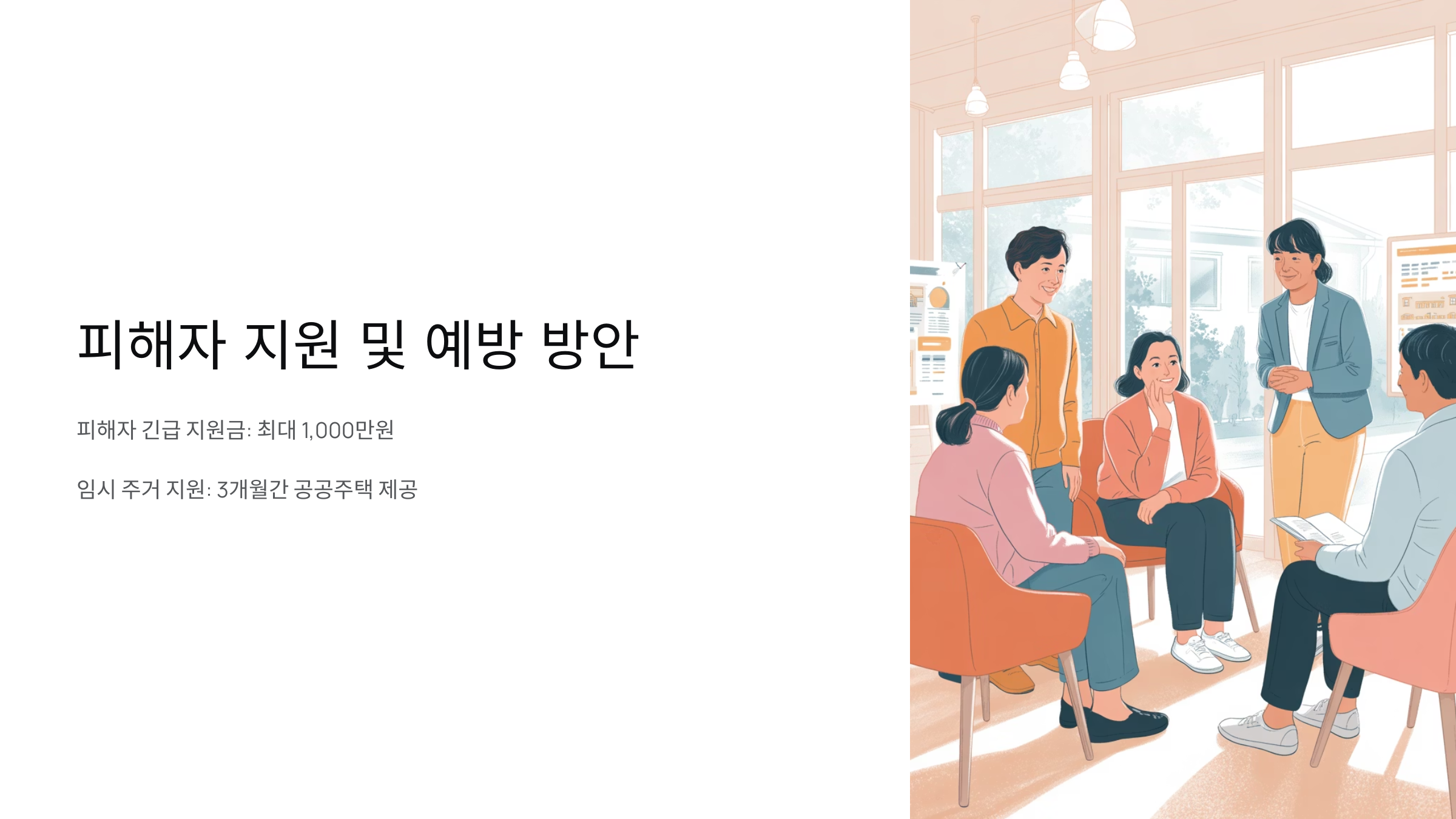 정부는 특별법 외에도 ▲공공임대 우선 공급 ▲LH 매입임대 우선 배정 ▲금융지원 프로그램 등 다양한 방식으로 피해자를 돕고 있어요. 하지만 행정 처리 속도나 지자체별 격차는 여전히 문제가 되고 있어요. 피해자 입장에서는 하루하루가 절박한데, 절차는 너무 복잡하다는 목소리도 크죠.