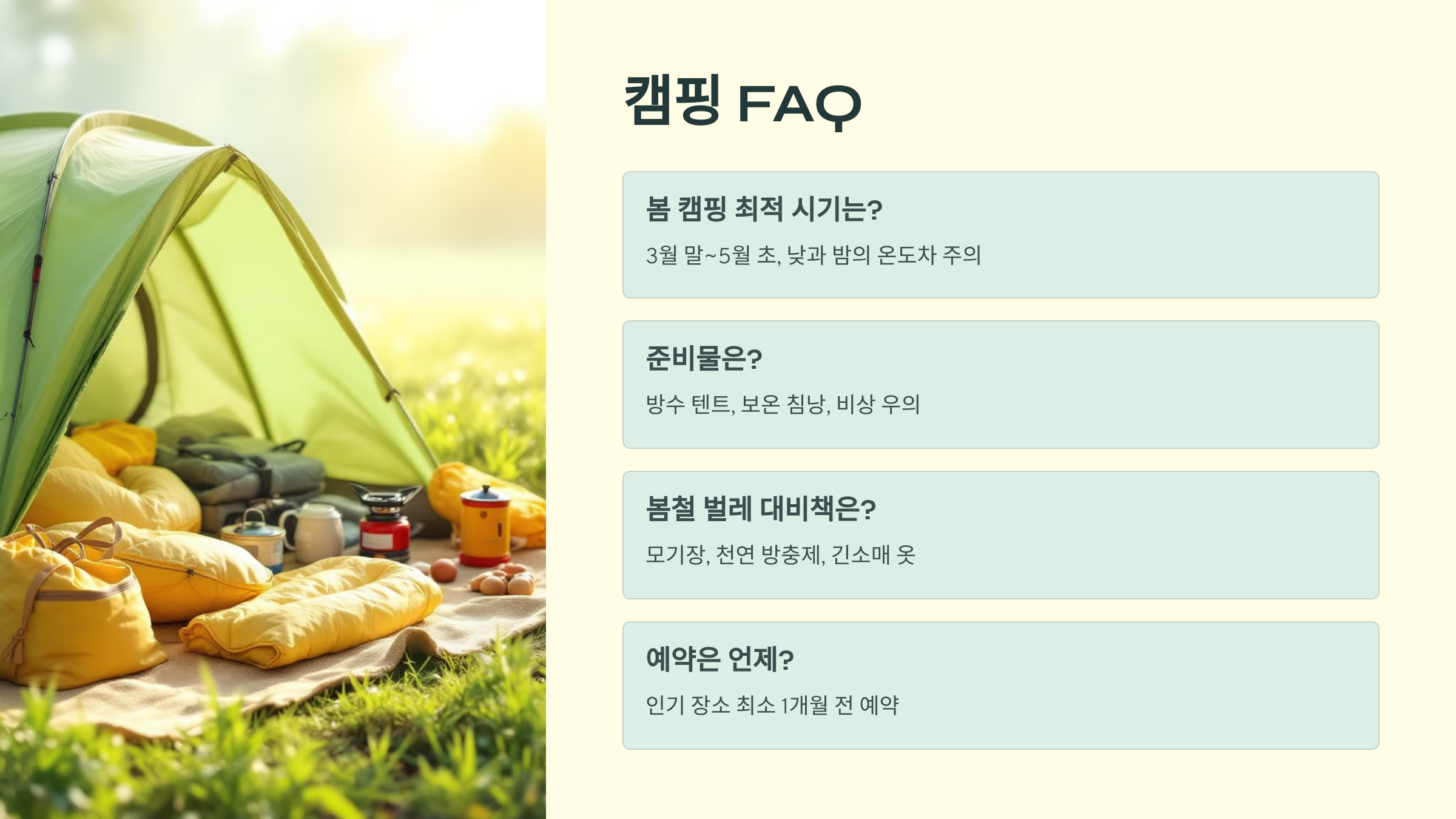 캠핑은 언제나 설레지만, 봄에 떠나는 캠핑은 그 설렘이 배가돼요. 겨울 동안 웅크렸던 몸과 마음을 활짝 펼칠 수 있는 계절, 따뜻한 햇살과 싱그러운 바람이 반겨주는 자연 속에서의 하룻밤… 그 자체가 힐링이죠 🌸⛺