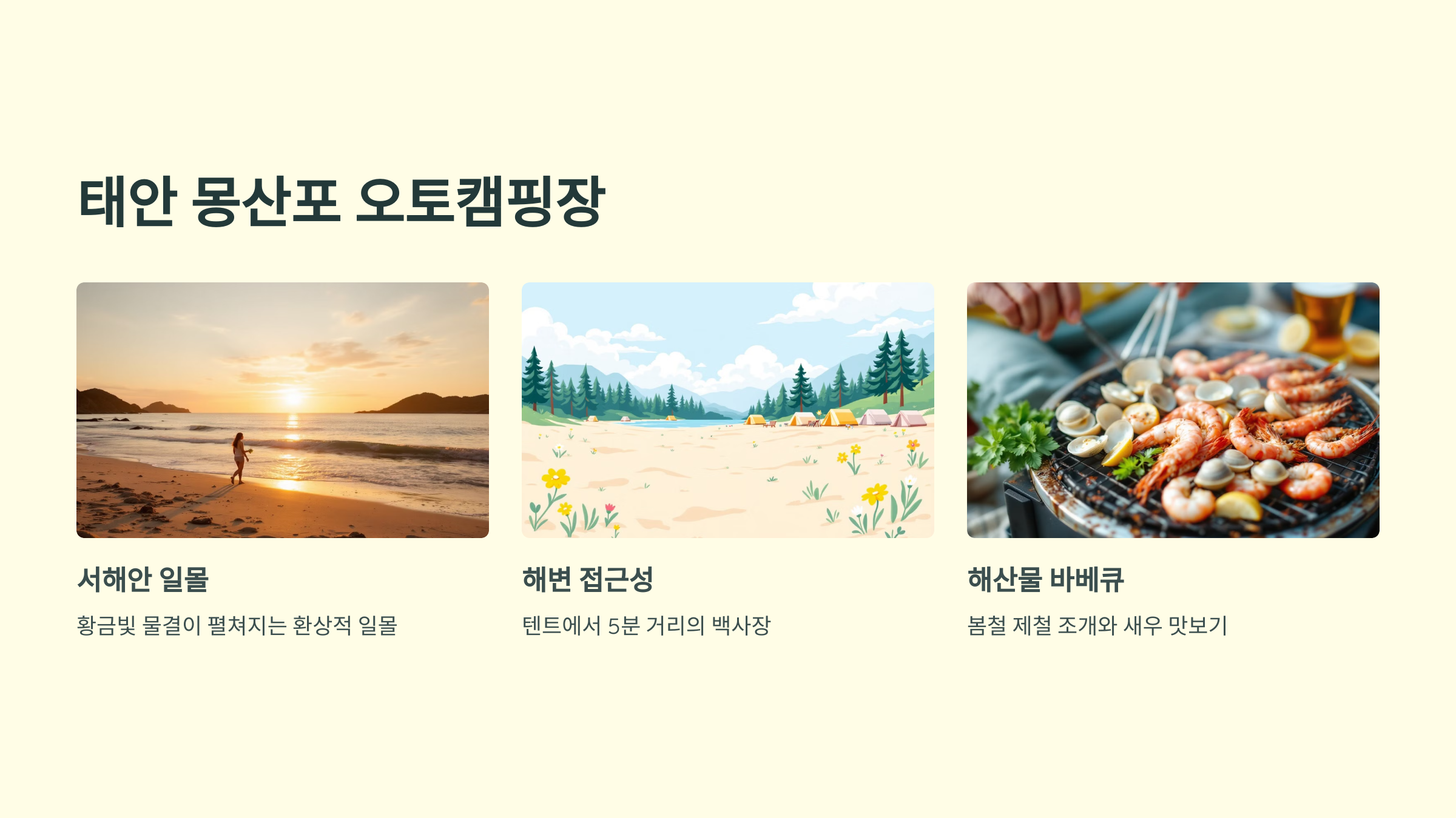 태안 몽산포는 낮엔 바다, 밤엔 별, 아침엔 파도소리로 시작하는 감성캠핑의 완성형 장소예요. 봄바다의 매력을 제대로 느껴보세요 🌤️⛺