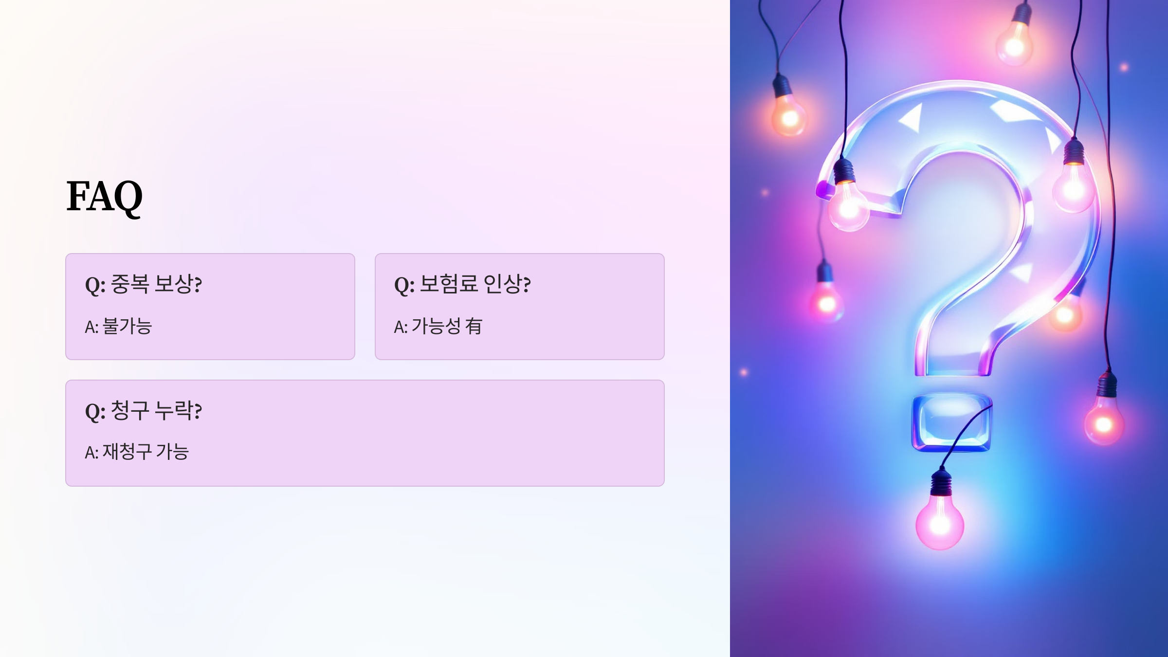 | 🏥 중복 청구 불가 | 기존 건강보험 또는 단체보험에서 보상받았으면 추가 청구 불가 |