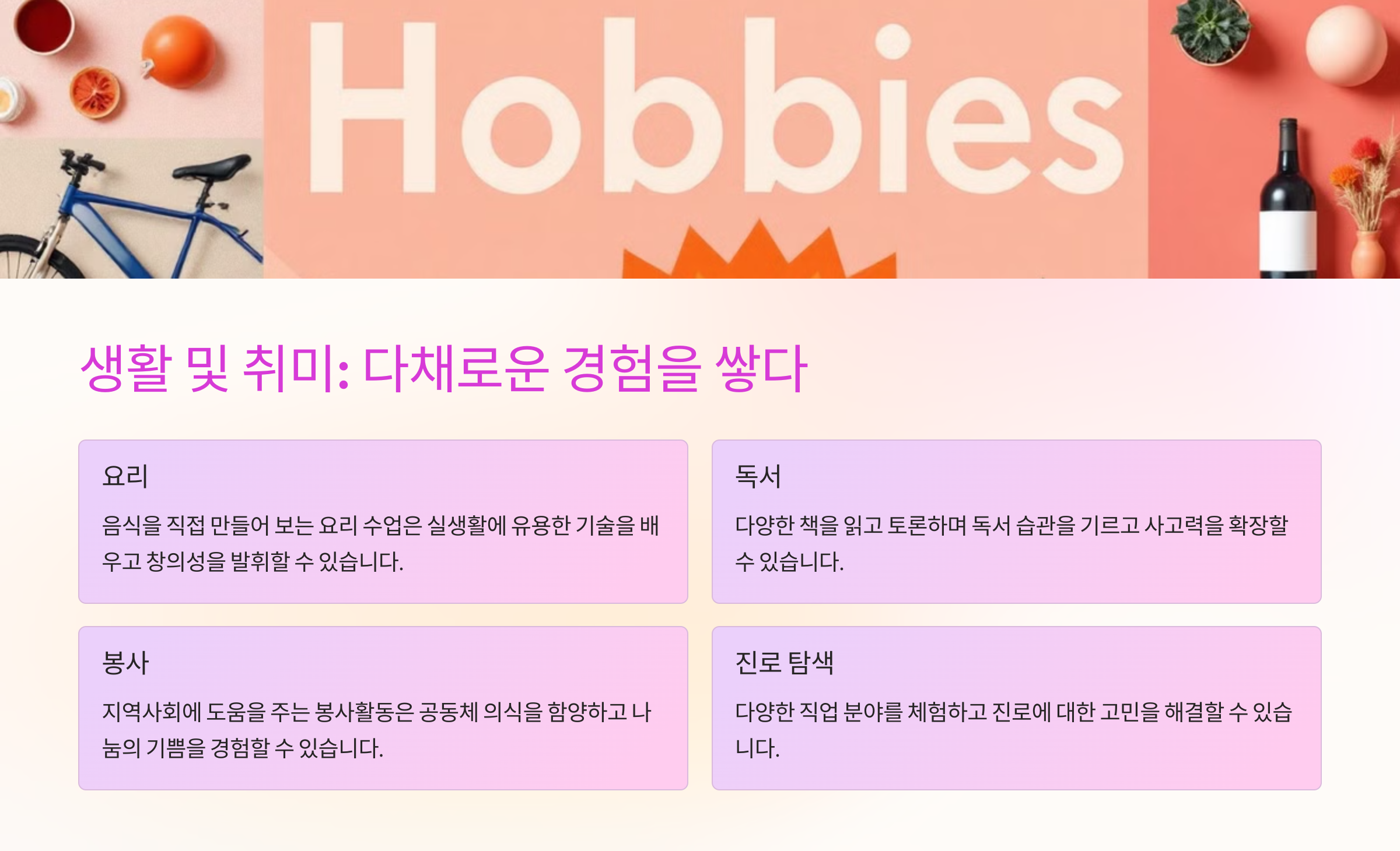생활 및 취미 중심의 방과후 수업은 실용적인 기술을 배우거나 즐거운 취미 활동을 통해 스트레스를 해소하는 데 적합해요.