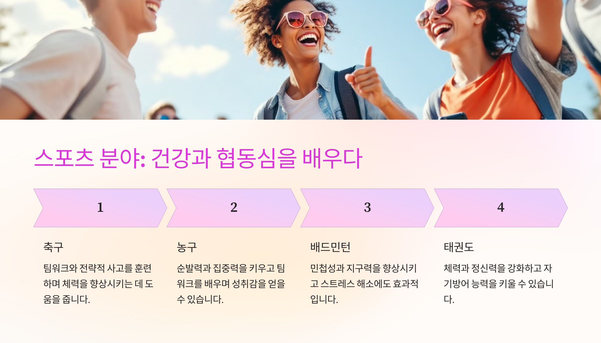 - 축구/농구: 팀 스포츠를 통해 협동심과 체력을 기를 수 있어요.