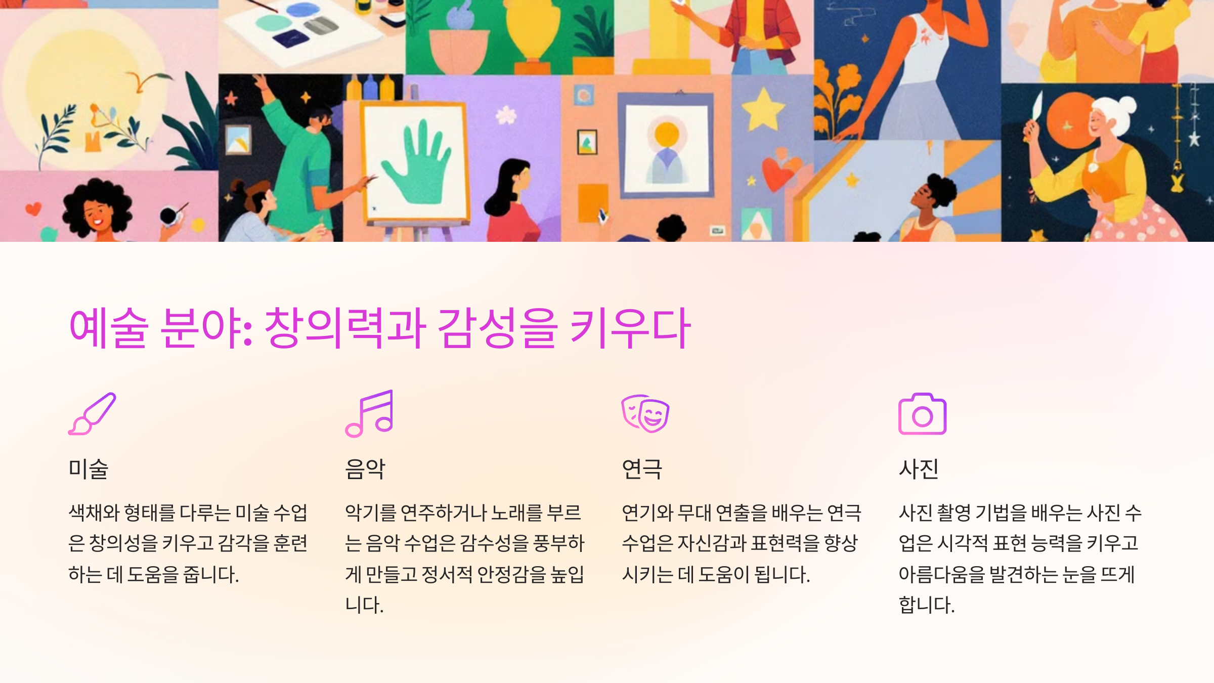 - 연극 수업: 연기를 통해 자신감을 키우고, 협동심을 배울 수 있어요.
