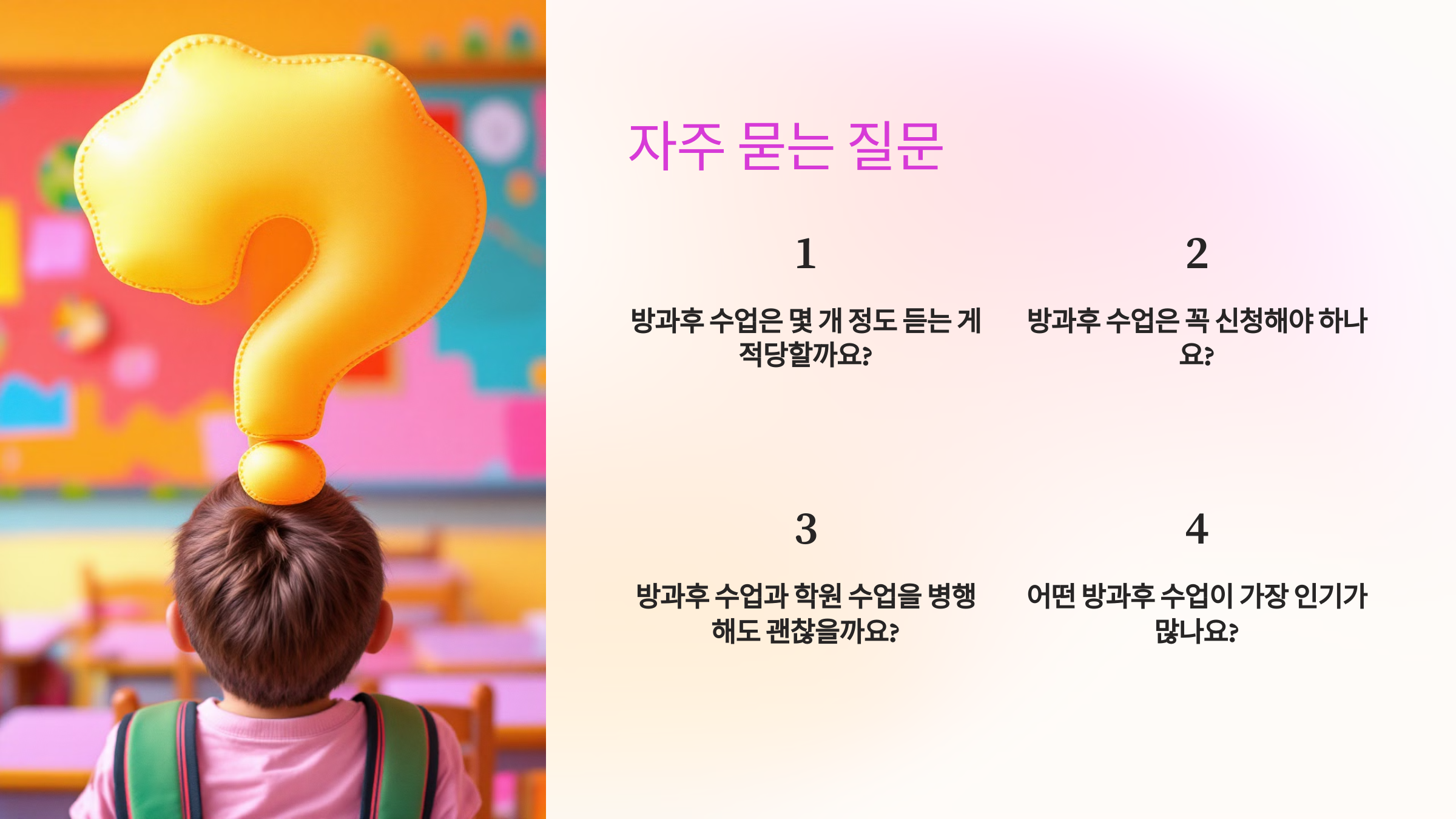 4. 시간과 거리: 방과후 수업이 너무 멀거나 시간이 맞지 않으면 부담이 될 수 있어요. 적절한 거리와 시간대를 고려하세요.