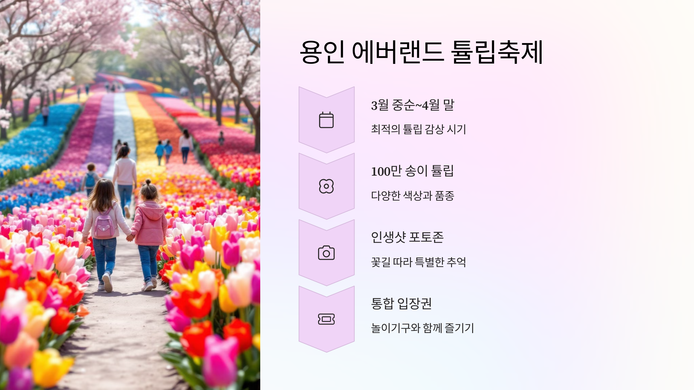아이와 함께 봄을 제대로 만끽하고 싶다면, 에버랜드 튤립축제만큼 확실한 선택은 없어요! 3월 중순부터 4월 말까지 열리는 이 축제는 놀이공원 속 꽃밭이라는 환상의 조합을 자랑해요 🌷