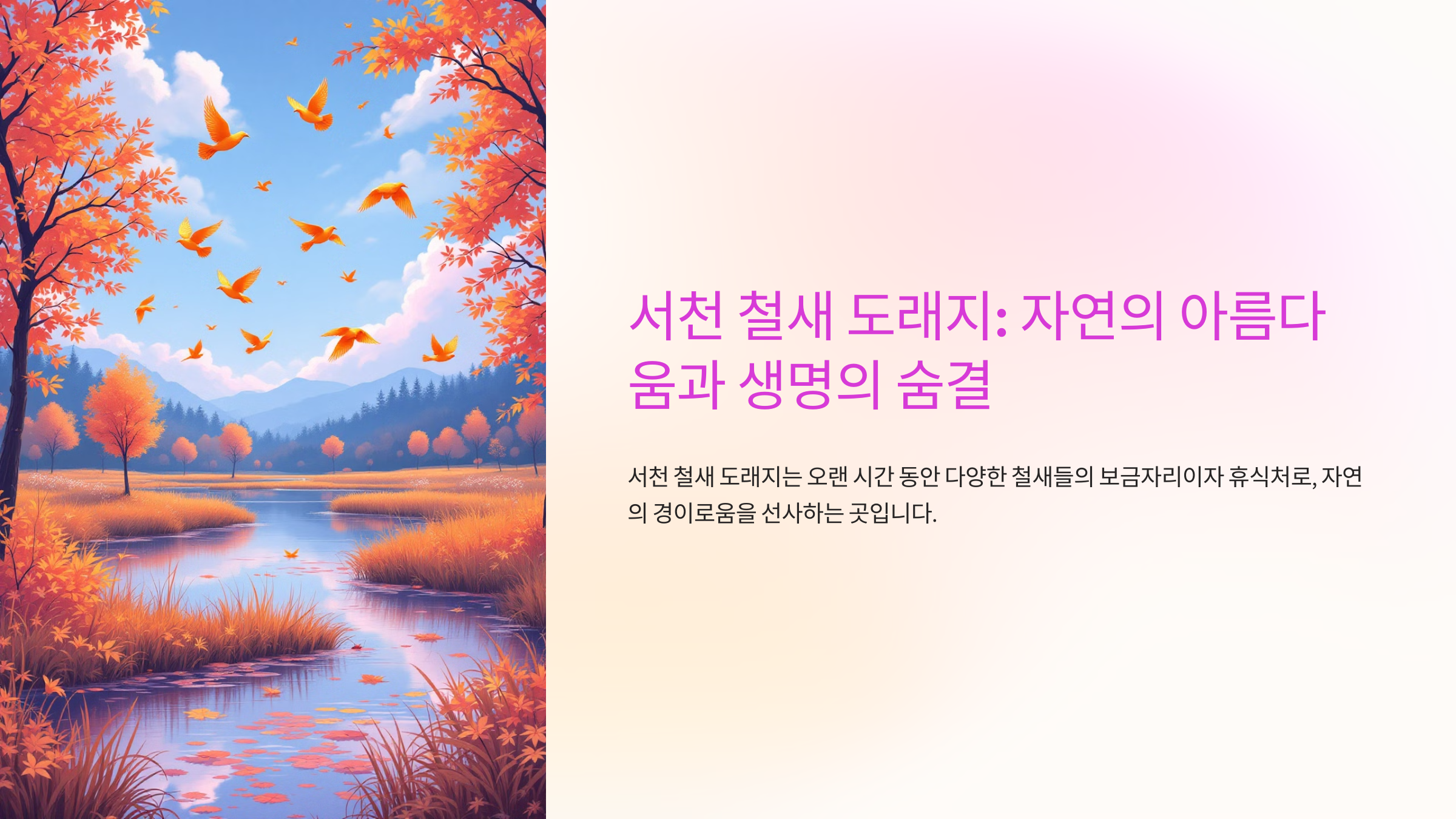 서천은 1980년대부터 철새 보호를 위한 다양한 노력을 이어왔어요. 그 결과, 현재 이곳은 철새와 인간이 공존하는 이상적인 생태 환경으로 자리 잡게 되었죠. 매년 겨울이면 서천으로 날아오는 기러기, 두루미, 오리 등 다양한 철새들은 그 자체로 하나의 자연 예술을 보여주고 있어요.