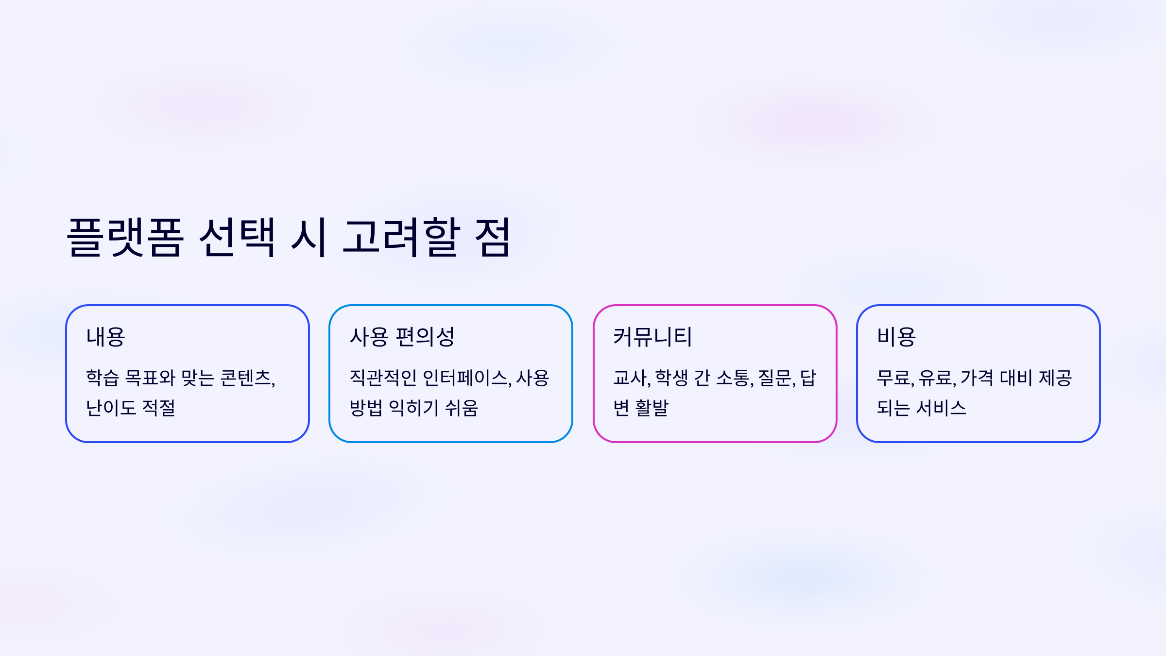 이처럼 플랫폼마다 장단점이 다르기 때문에, 아이의 학습 스타일과 필요에 맞는 플랫폼을 선택하는 것이 중요해요.