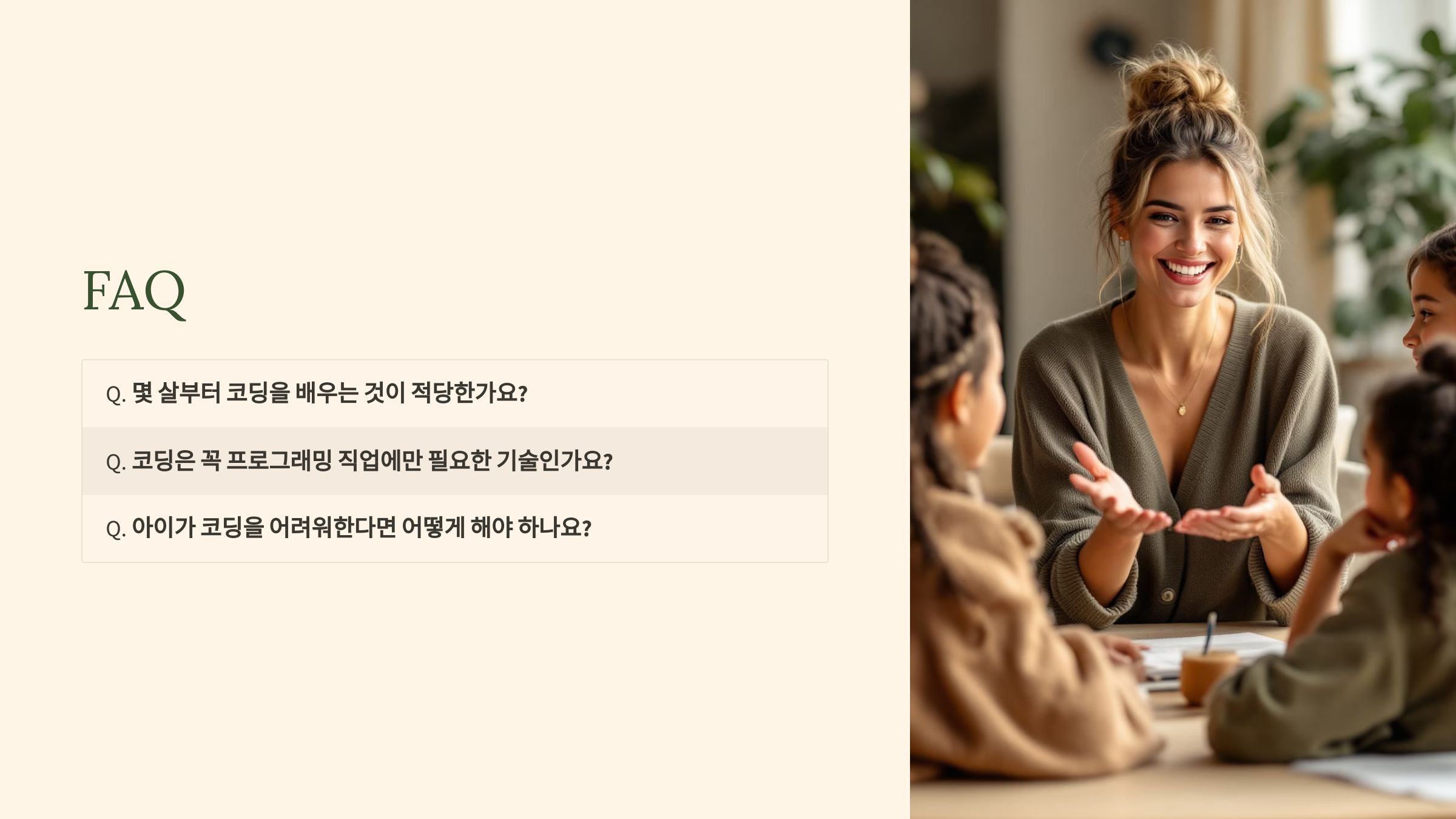 A2. 아니에요. 코딩은 문제 해결 능력, 논리적 사고, 창의력 등 다양한 능력을 키워줘요. 이는 모든 직업과 일상에서 활용될 수 있는 중요한 기술이에요.