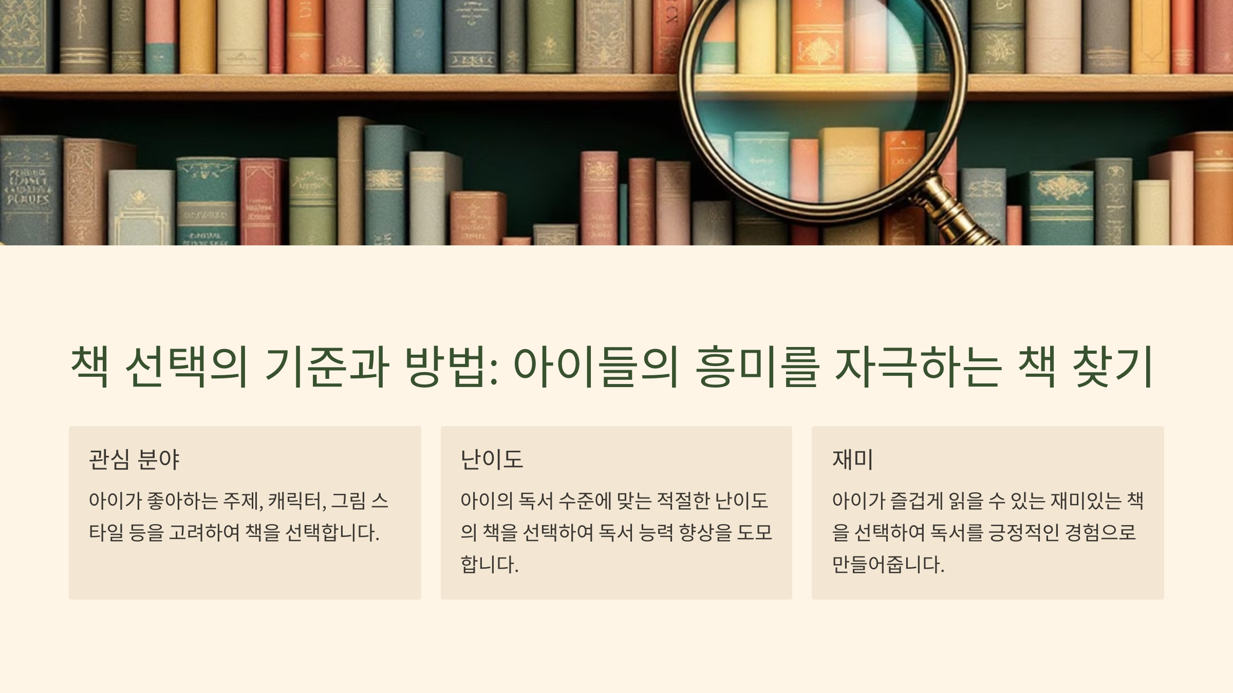 주인공이 아이와 비슷한 연령대인 책은 더 큰 공감을 불러일으킬 수 있어요. 또, 아이가 특정 주제에 관심을 보인다면, 그와 관련된 책을 골라주는 것도 좋은 방법이에요. 이런 접근은 아이가 책 읽기에 더욱 몰입하도록 도와준답니다.