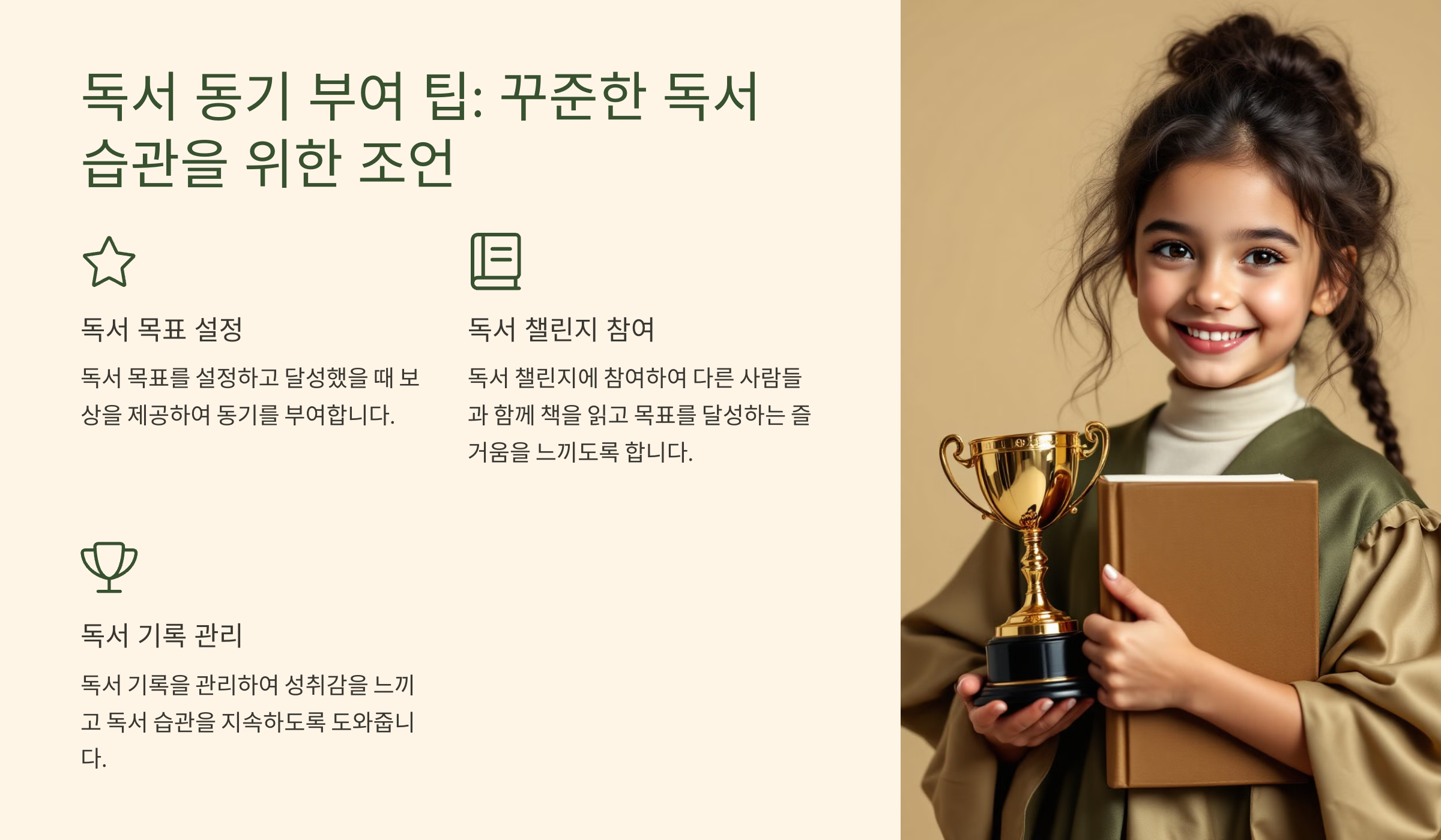 독서를 좋아하게 만들기 위해서는 흥미를 자극할 수 있는 방법을 사용하는 것이 중요해요. 책을 읽고 나서 작은 보상을 제공하거나, 독서 목표를 설정하는 것이 아이의 동기를 높이는 데 효과적이에요. 예를 들어, 한 달에 책 다섯 권 읽기 같은 도전 과제를 주는 것도 좋아요.