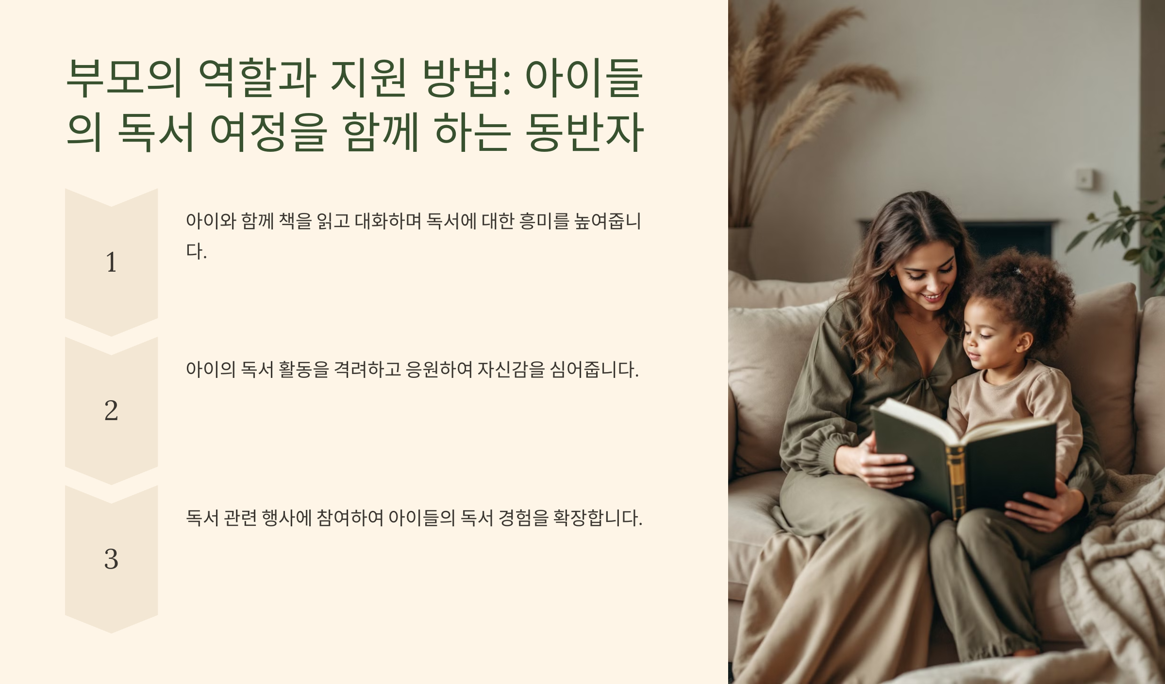 부모는 초등학생이 독서를 좋아하도록 돕는 중요한 역할을 해요. 아이가 독서를 즐길 수 있도록 긍정적인 분위기를 만들어주는 것이 필요해요. 예를 들어, 아이가 책을 읽은 뒤 칭찬하거나, 함께 책의 내용을 이야기하는 시간을 가져보세요. 이런 작은 격려가 큰 차이를 만들어요.
