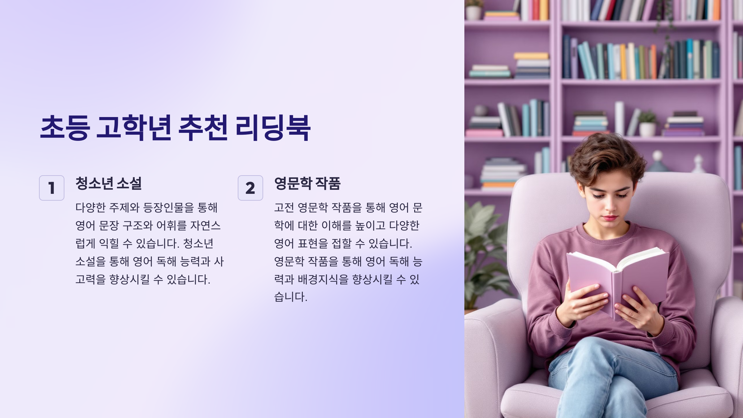 - Harry Potter Series (J.K. Rowling): 전 세계적으로 사랑받는 판타지 시리즈로, 흥미로운 이야기와 풍부한 어휘를 제공합니다.