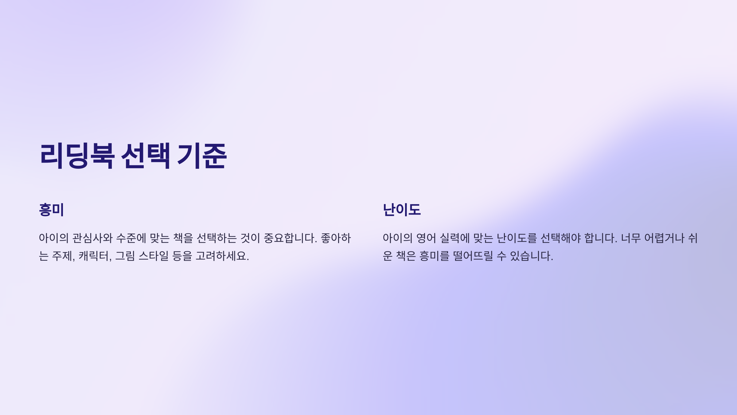 아이에게 적합한 리딩북을 선택하는 것은 영어 학습의 출발점이에요. 선택 시 고려해야 할 중요한 기준을 알려드릴게요: