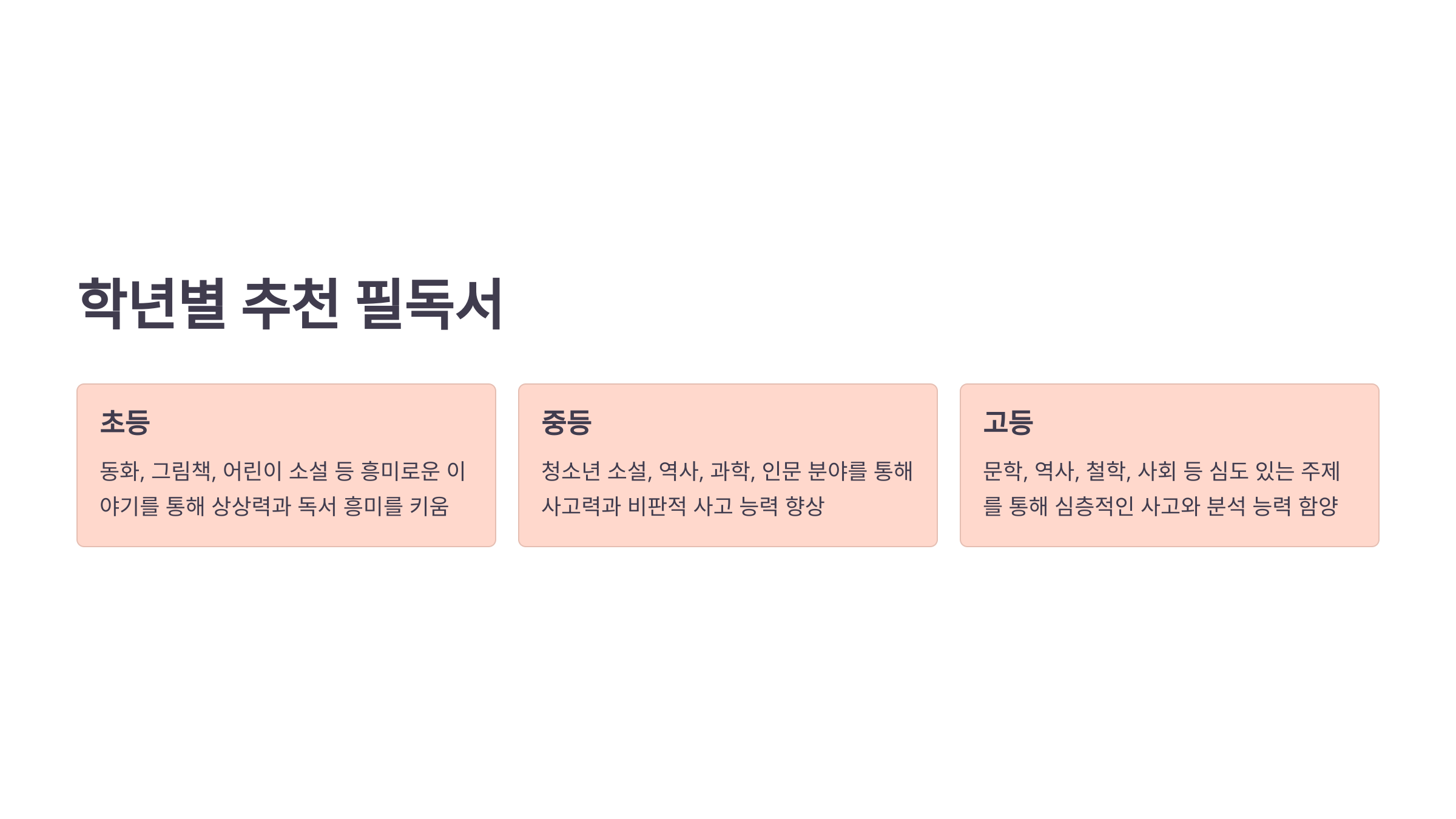 이처럼 학년별로 아이들의 발달 단계와 흥미를 고려해 책을 선정하는 게 중요해요. 적절한 필독서를 통해 학습 능력뿐만 아니라 정서적인 성장을 도울 수 있답니다.