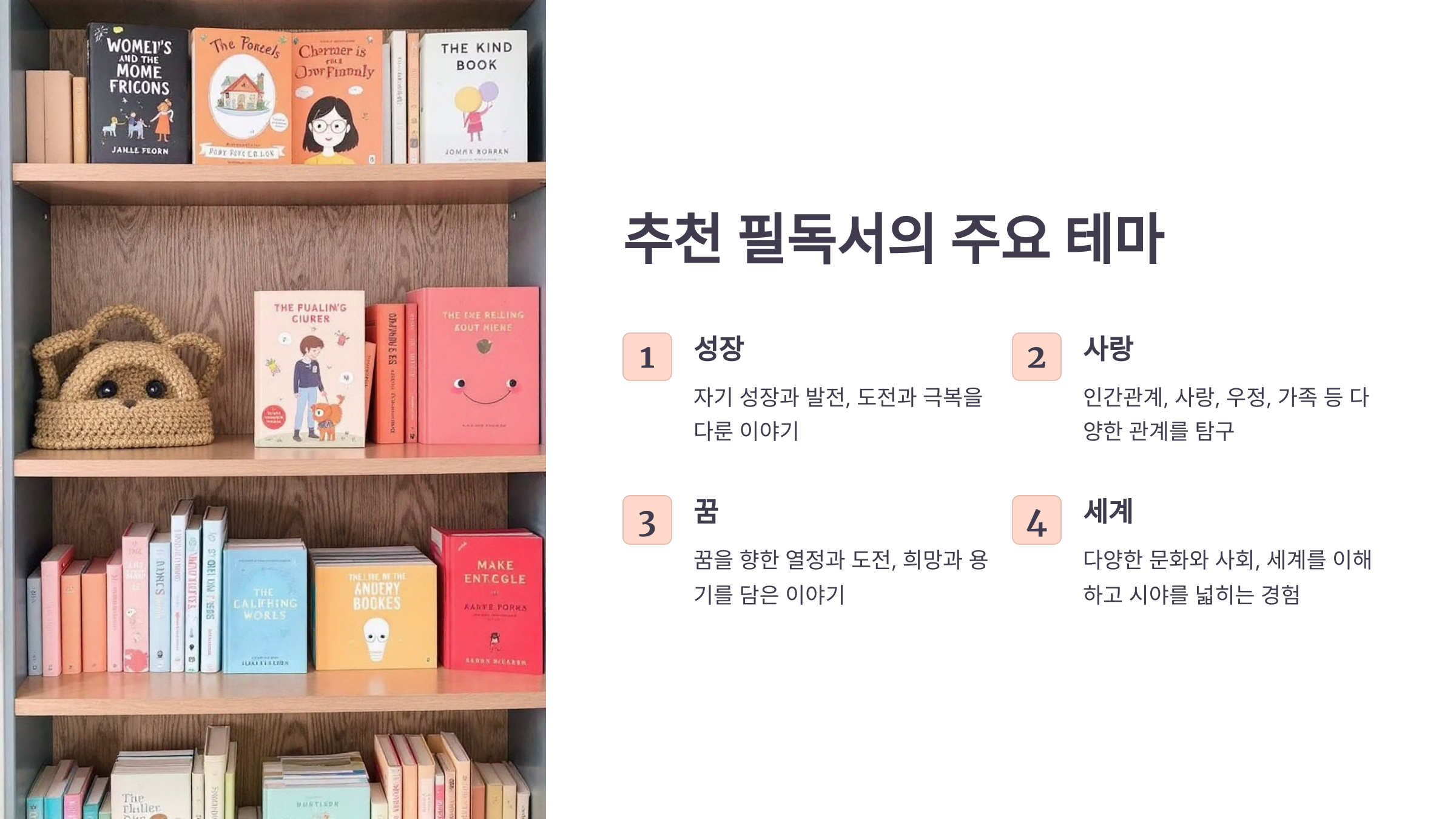 필독서에는 여러 가지 주요 테마가 있어요. 첫 번째는 우정과 가족이에요. 『모모와 토토』와 같은 책은 따뜻한 감성과 관계의 소중함을 알려주죠. 이런 테마는 아이들에게 긍정적인 정서를 전달해요.