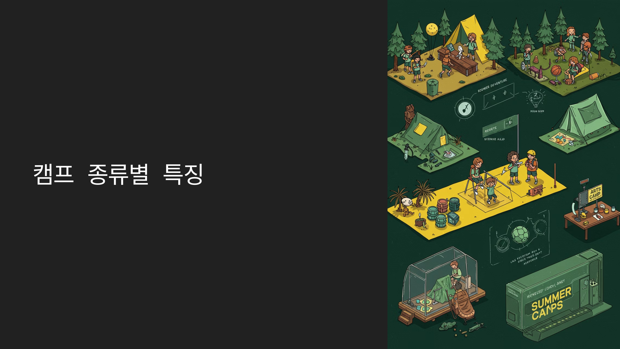 다음 섹션에서는 어떤 종류의 캠프가 있는지, 각각 어떤 특징이 있는지 알려드릴게요! 🎪