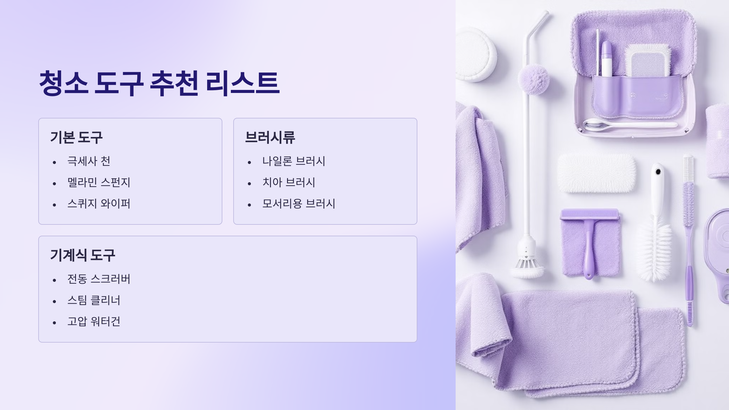 물때를 쉽게 제거하려면 세제만큼 중요한 게 바로 도구 선택이에요. 아무리 좋은 세제를 써도 도구가 맞지 않으면 오히려 표면을 상하게 하거나 효과가 떨어질 수 있답니다. 그래서 오늘은 꼭 하나쯤 갖춰야 할 청소 도구들을 알려드릴게요.