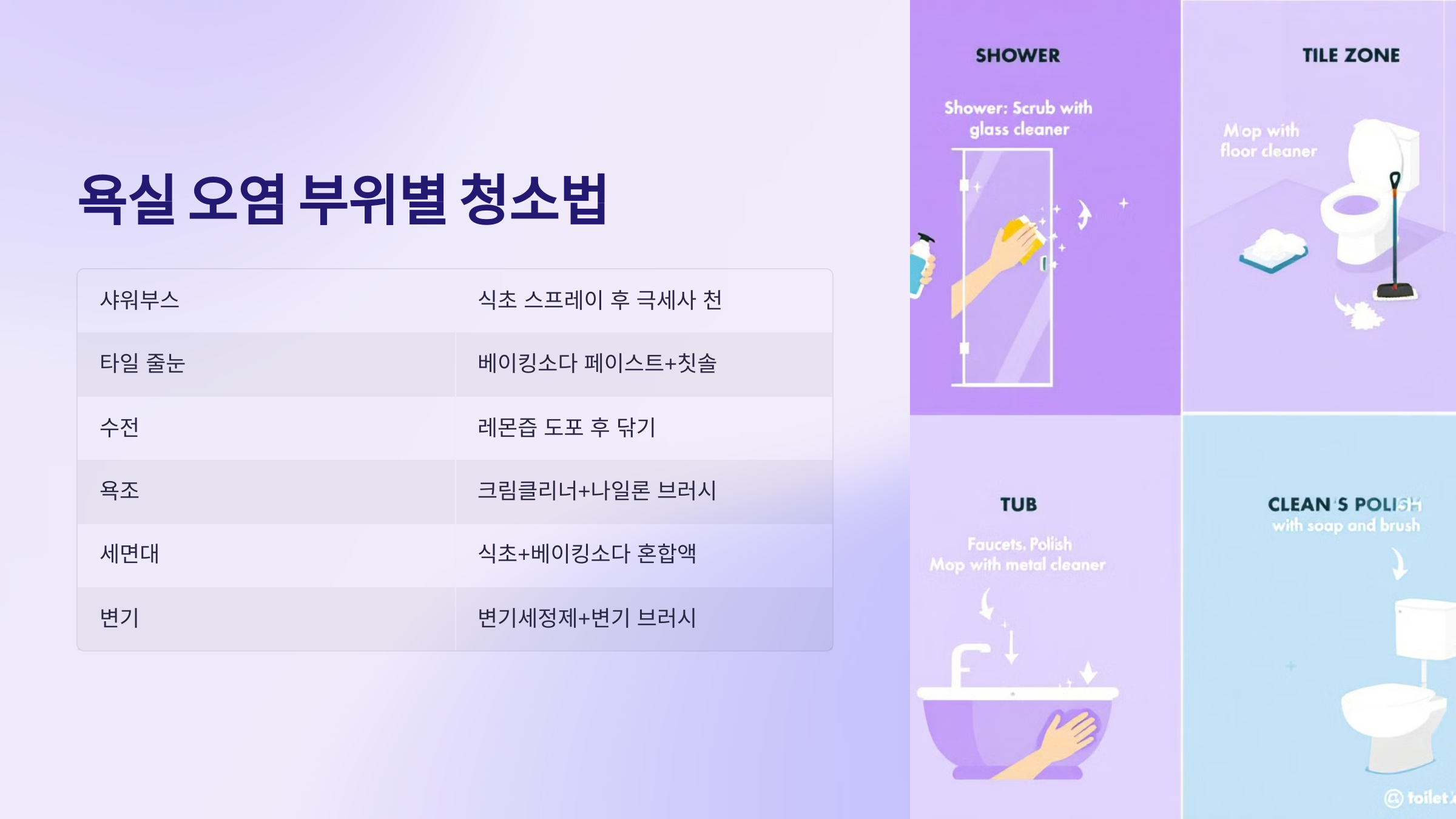 부위별로 맞는 도구와 세제를 선택하는 게 욕실 청소의 핵심이에요. 정해진 루틴으로 한 번만 제대로 청소해두면 한동안 물때 걱정 없이 지낼 수 있답니다! 💧