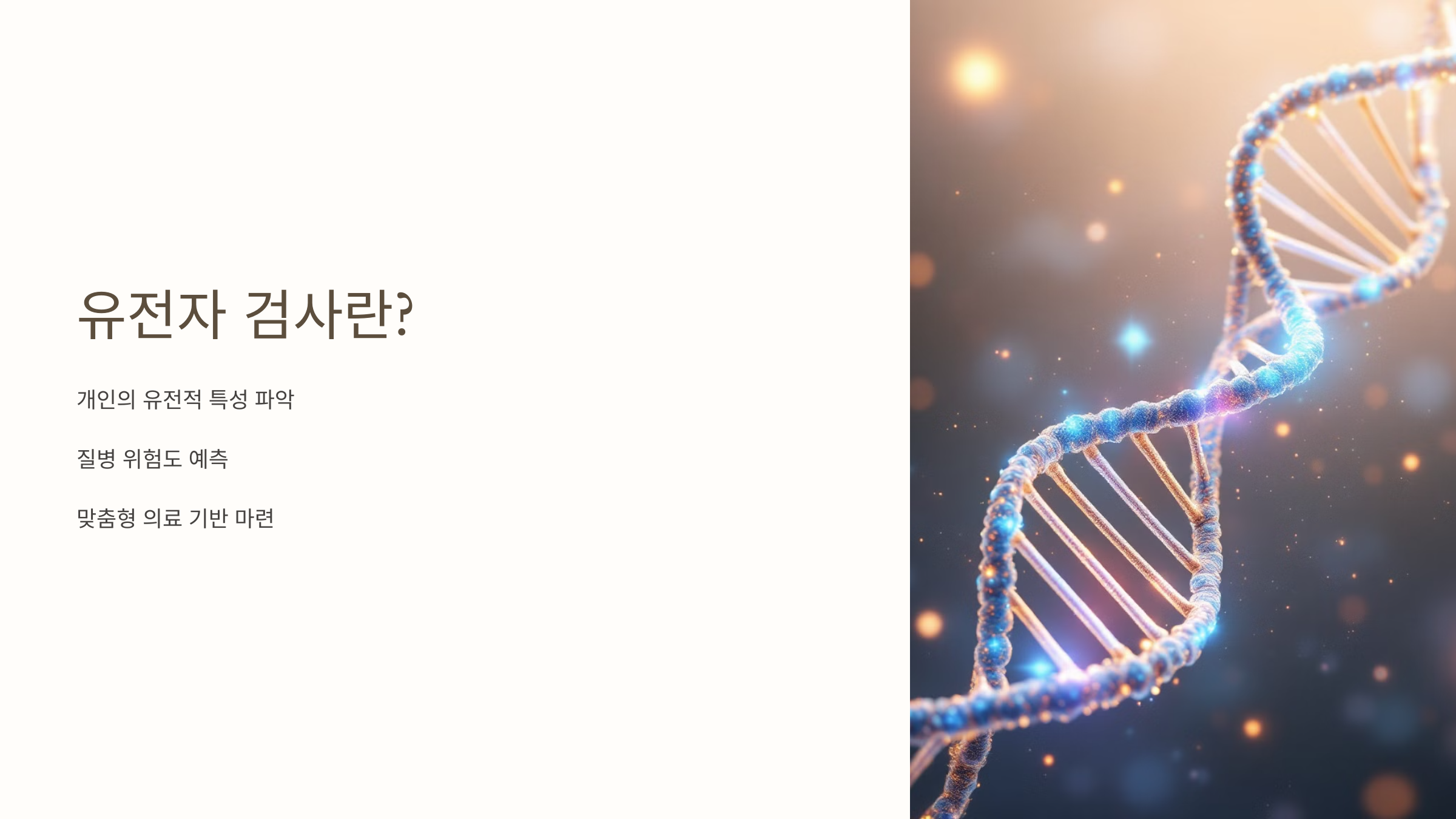유전자 검사는 DNA를 분석하여 질병 위험도, 체질, 유전적 특징 등을 파악하는 검사예요. 최근에는 건강 관리뿐만 아니라 맞춤형 식단, 운동 계획에도 활용되면서 인기가 높아지고 있어요. 🏥