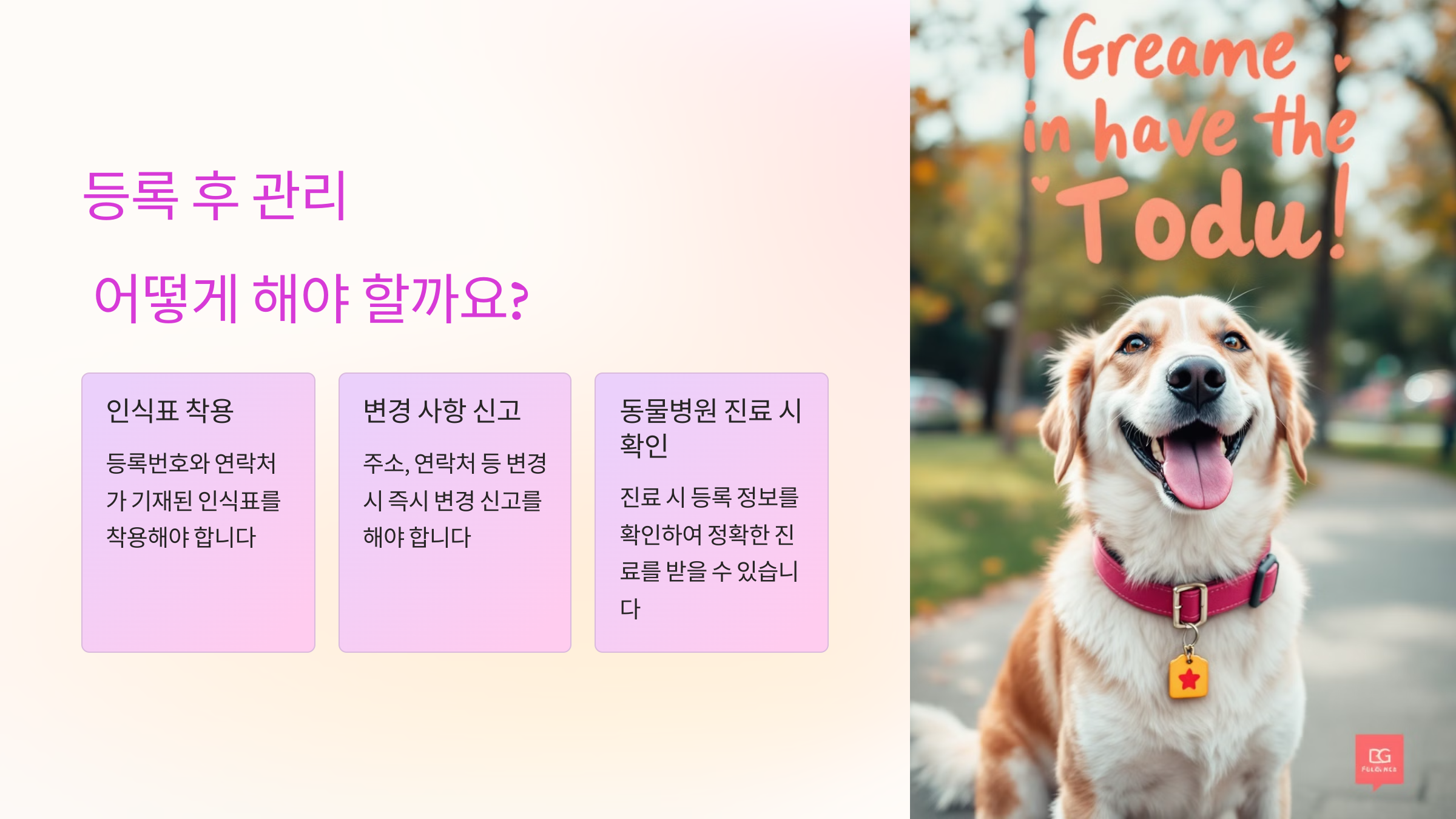 반려동물 등록은 모든 반려인에게 주어진 중요한 의무로, 동물의 안전과 보호를 위한 제도예요. 특히 개를 키우는 보호자라면, 유기 동물 문제를 줄이고, 반려동물이 실종될 경우 빠르게 찾을 수 있도록 꼭 등록해야 해요.