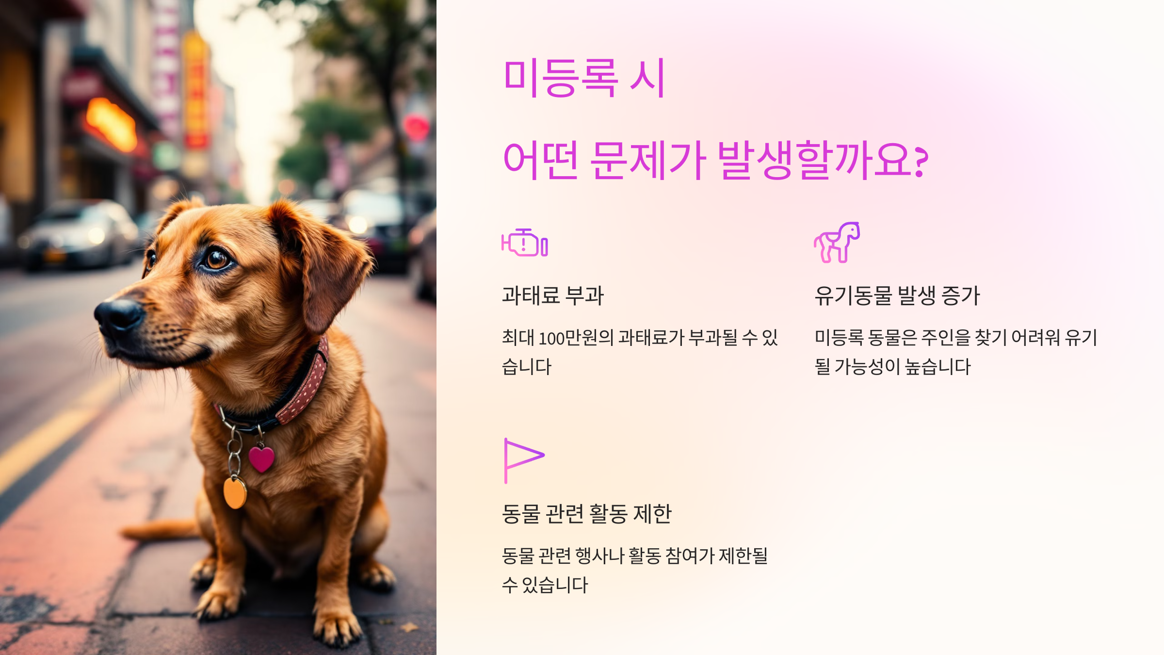 미등록된 반려동물은 실종될 경우 찾기가 훨씬 어려워져요. 반려동물 구조 기관이나 보호소에서 주인의 정보를 확인할 방법이 없기 때문이에요. 따라서 등록은 반려동물의 안전과 보호를 위한 최소한의 장치라고 볼 수 있어요.