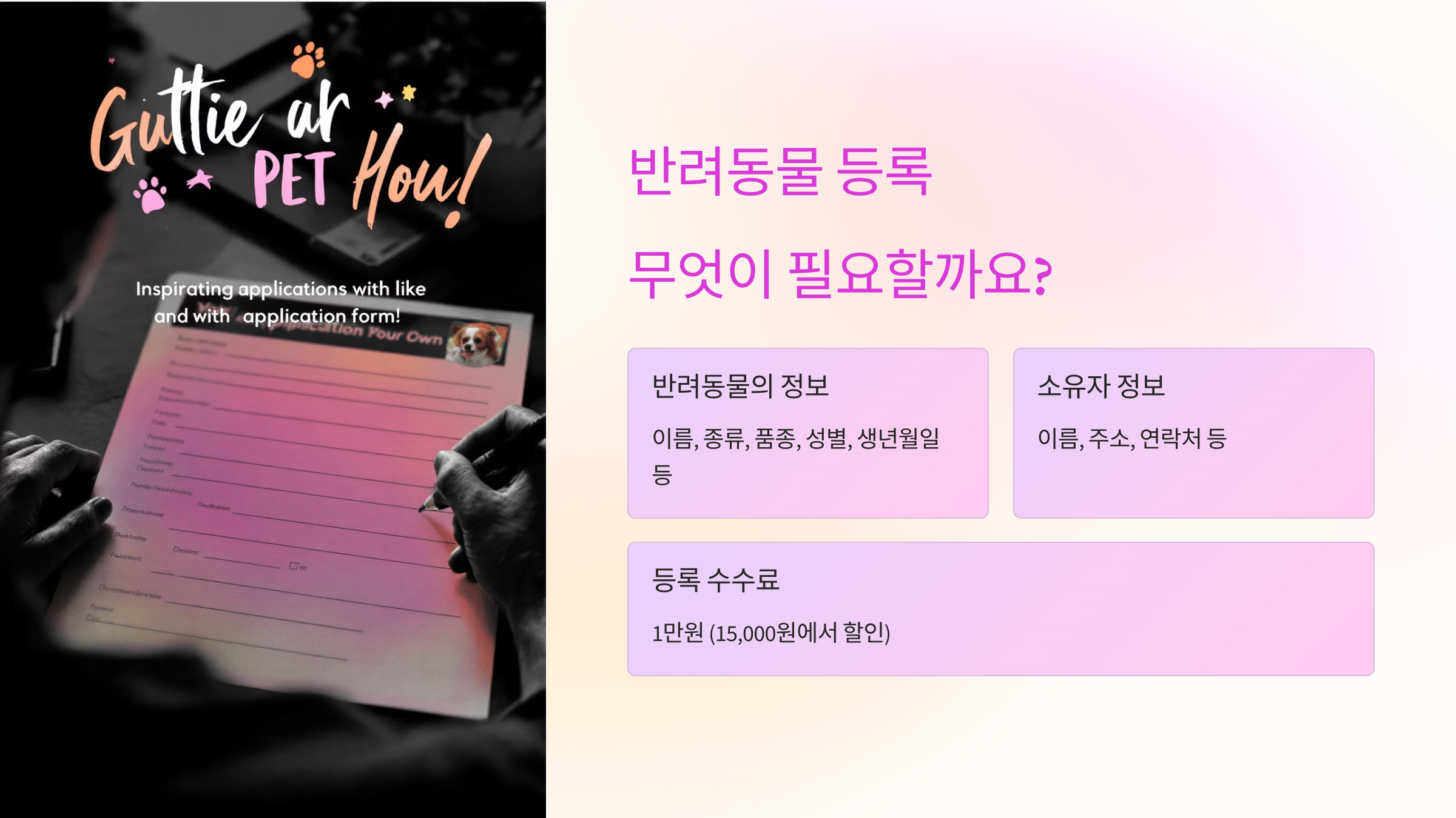 A1. 반려동물 등록은 동물병원, 지자체, 또는 등록 대행 기관에서 할 수 있어요. 가까운 등록소를 검색해서 방문하세요.
